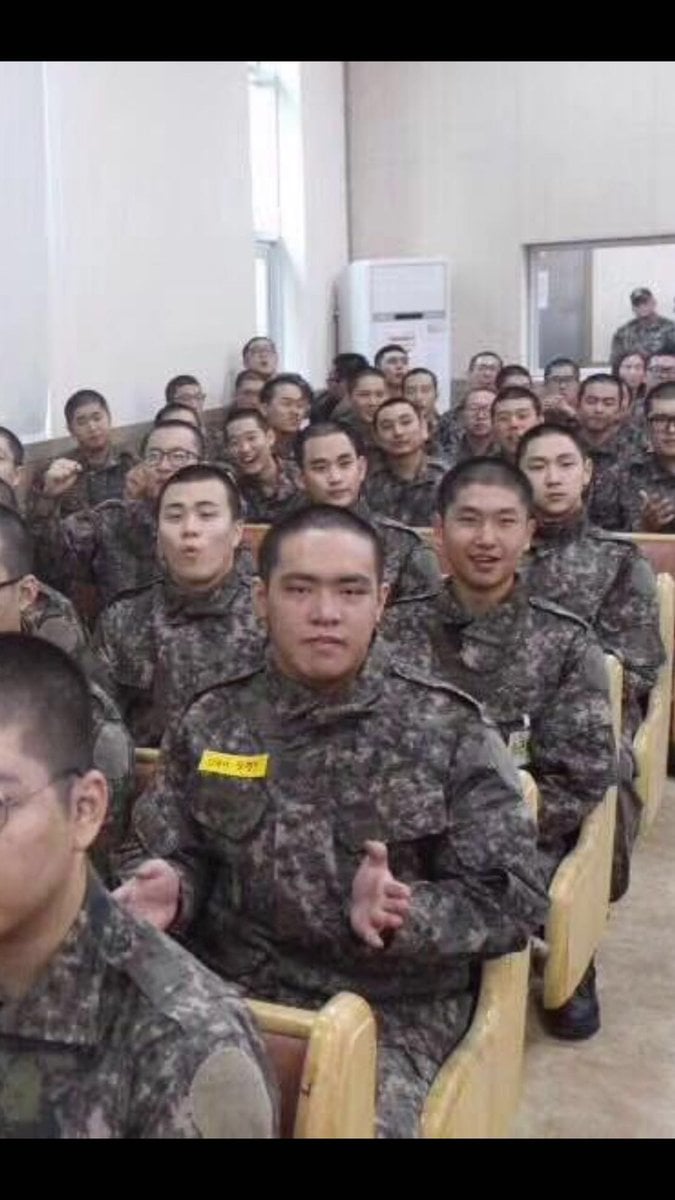 ▼與軍中同袍坐在一起的金秀賢,還是相當容易辨認。