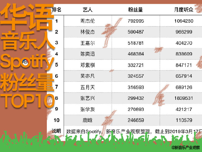 知名音樂串流平台「Spotify」源自於瑞典,在全球的使用人數高達上億人,是現今相當熱門的平台,而Spotify最大的特色之一就是「播放清單」,Spotify會根據當下的時間,在音樂首頁上推薦官方播放清單,然而在播放清單裡的曲目,很大的機率是你從來沒聽過的,這同時也讓使用者有機會認識新的歌曲。近日,有網友整理出「華語音樂人」在Spotify上的粉絲量排行TOP10。