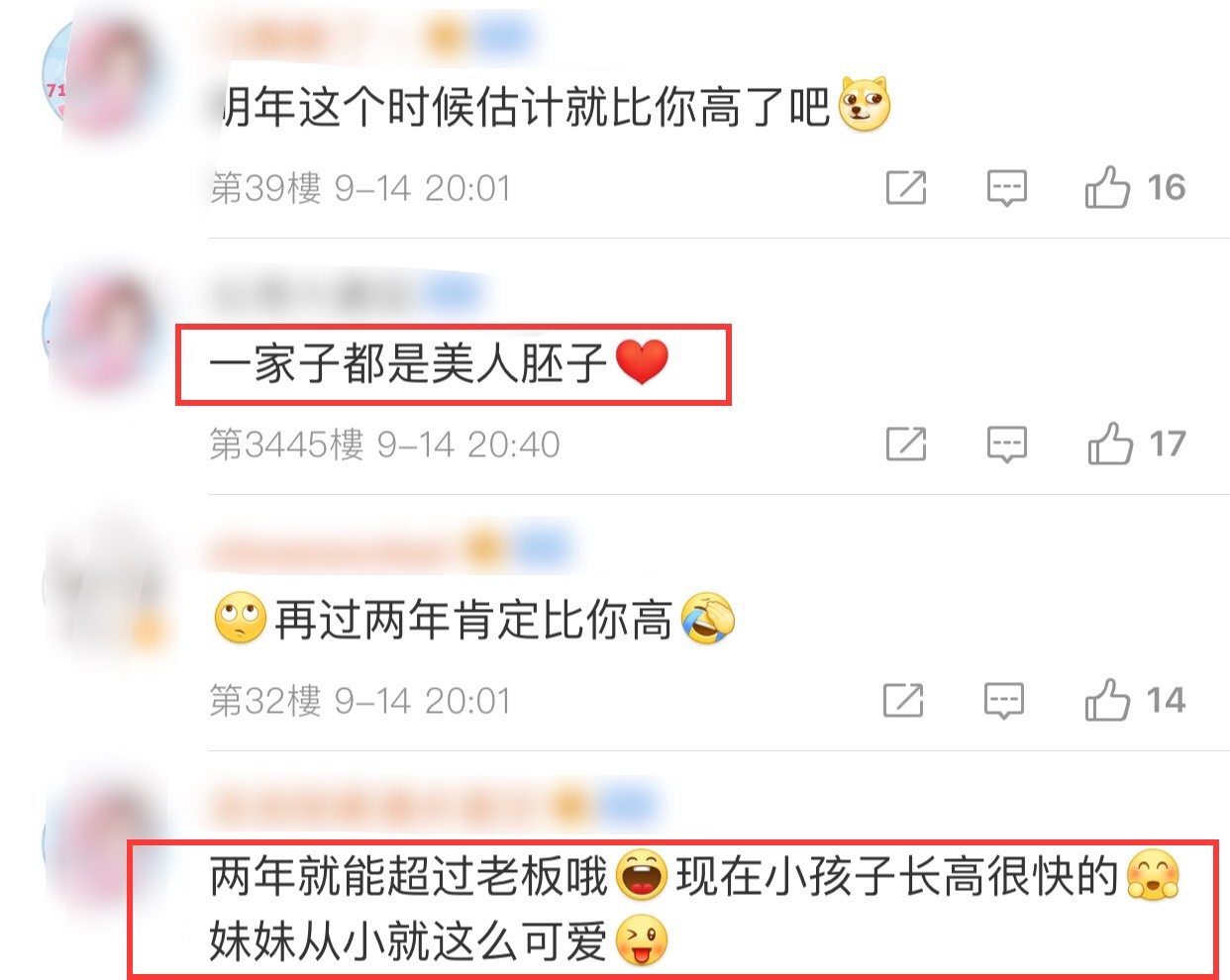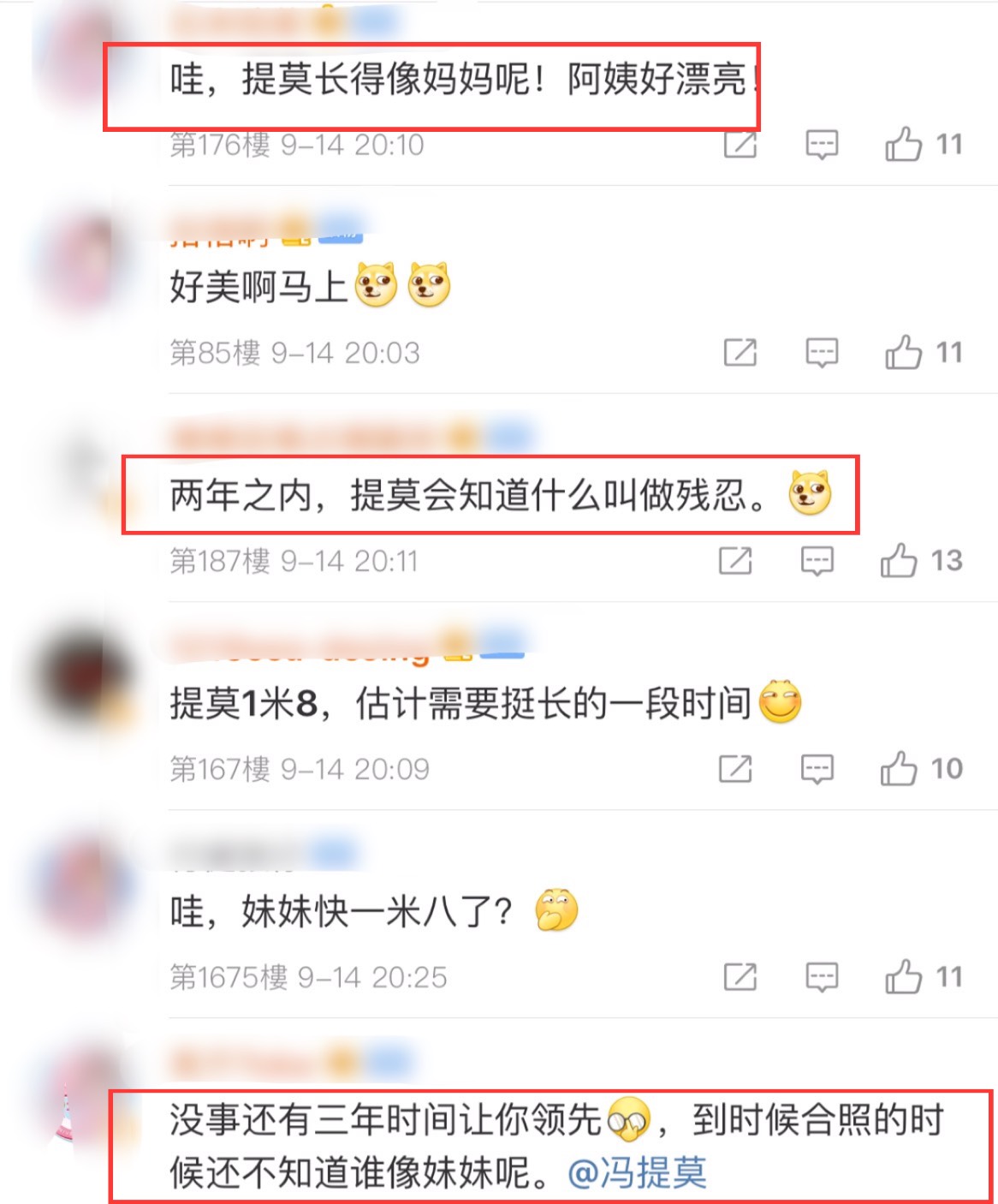 除了放送粉絲福利外,自己也逗趣的說「妹妹快比我高了,請問還有幾年超過我?」,外傳馮提莫的身高只有150,從照片上來看馮提莫的妹妹身高落在她的肩膀,要超過她的身高可是指日可待。讓網友紛紛說道「兩年之內,提莫會知道甚麼叫做殘忍」、「沒事還有三年時間讓你領先,到時候合照還不知道誰向妹妹呢」、「一家人都是美人胚子」、「兩年技能超過老闆喔、小孩子長很快的妹妹從小就這麼可愛」