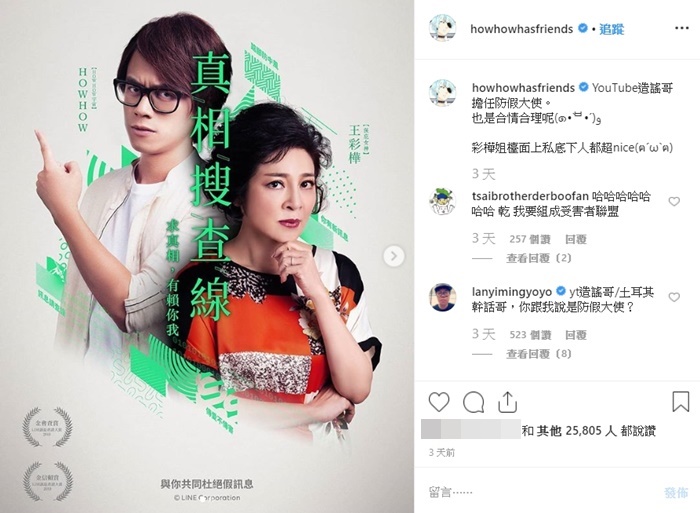 實際上點進HowHow的IG,可以看到他和王彩樺一同擔任「防假大使」,當時HowHow有趣地寫下,「YouTube造謠哥擔任防假大使。也是合情合理呢」然而兩人在八點檔的置入演出,確實成功引起一波話題!