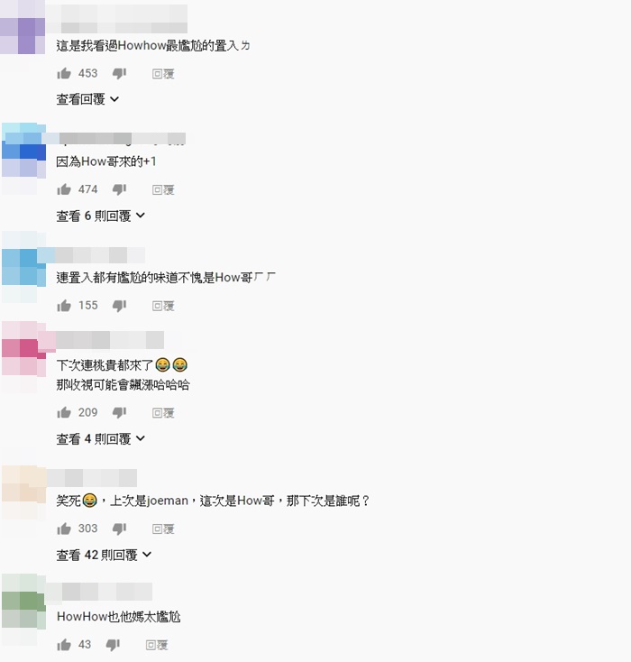 HowHow無預警的出現,立刻在網上掀起討論,而他「爆尷尬」的置入,也讓不少人在剪輯後的影片下方留言,「這是我看過Howhow最尷尬的置入ㄌ」、「連置入都有尷尬的味道不愧是How哥ㄏㄏ」、「上次是joeman,這次是How哥,那下次是誰呢?」、「HowHow也他媽太尷尬」、「炮仔聲真的有跟上時代噢」。