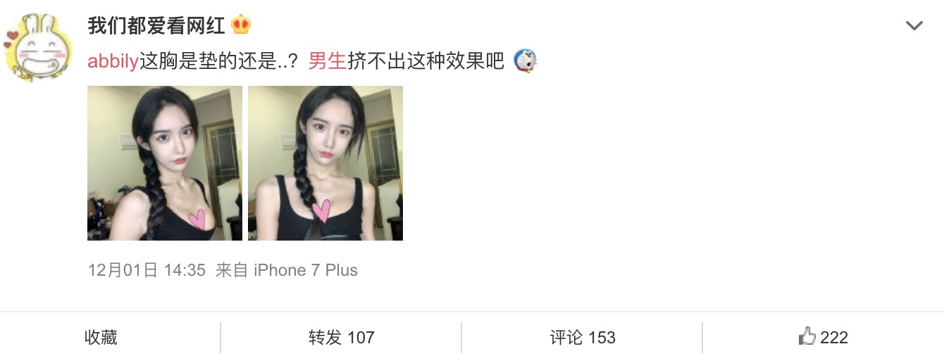 這次他PO出穿著小可愛的性感美照,一名網友在微博上發文表示:「abbily這胸是墊的還是……?男生擠不出這種效果吧」,再次引起話題,這篇文章甚至超過一百多則網友回應。