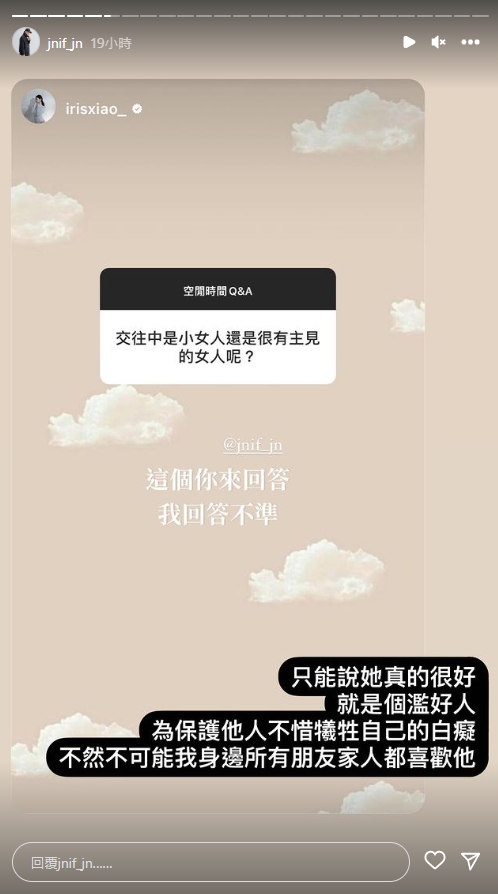 傑恩透露與閃亮亮已經認識至少六年,大概知道對方的為人,因緣際會之下聊了很多事情,再加上個性跟想法很合,所以才發展成情侶關係。在傑恩眼裡,閃亮亮是個非常善良、可愛、單純的小女孩,「為了保護她人,不惜讓自己受傷的女孩」,更形容她是一個「濫好人」,也是因為個性這麼好,才能讓身邊的人都喜歡。