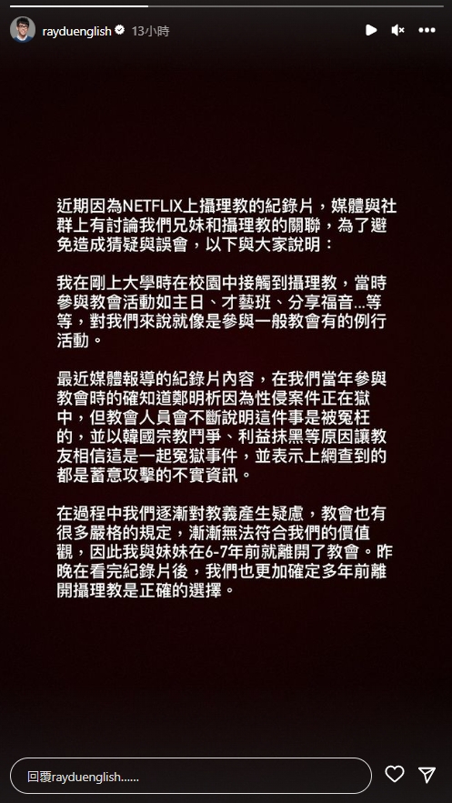 當年在教會的時候,的確知道鄭明析因性侵案而在監獄中,「但教會人員不斷說明這件事是被冤枉的,並以韓國宗教鬥爭、利益抹黑等原因,讓教友相信這是一起冤獄事件,並表示上網查到的都是蓄意攻擊的不實資訊。」過程中,兄妹倆逐漸對攝理教產生疑慮,再加上教會有很嚴格的規定,逐漸發現價值觀不合,「因此我與妹妹在6-7年前就離開了教會。」他更慶幸地說:「看完紀錄片後,我們也更加確定多年前離開攝理教是正確的選擇。」
