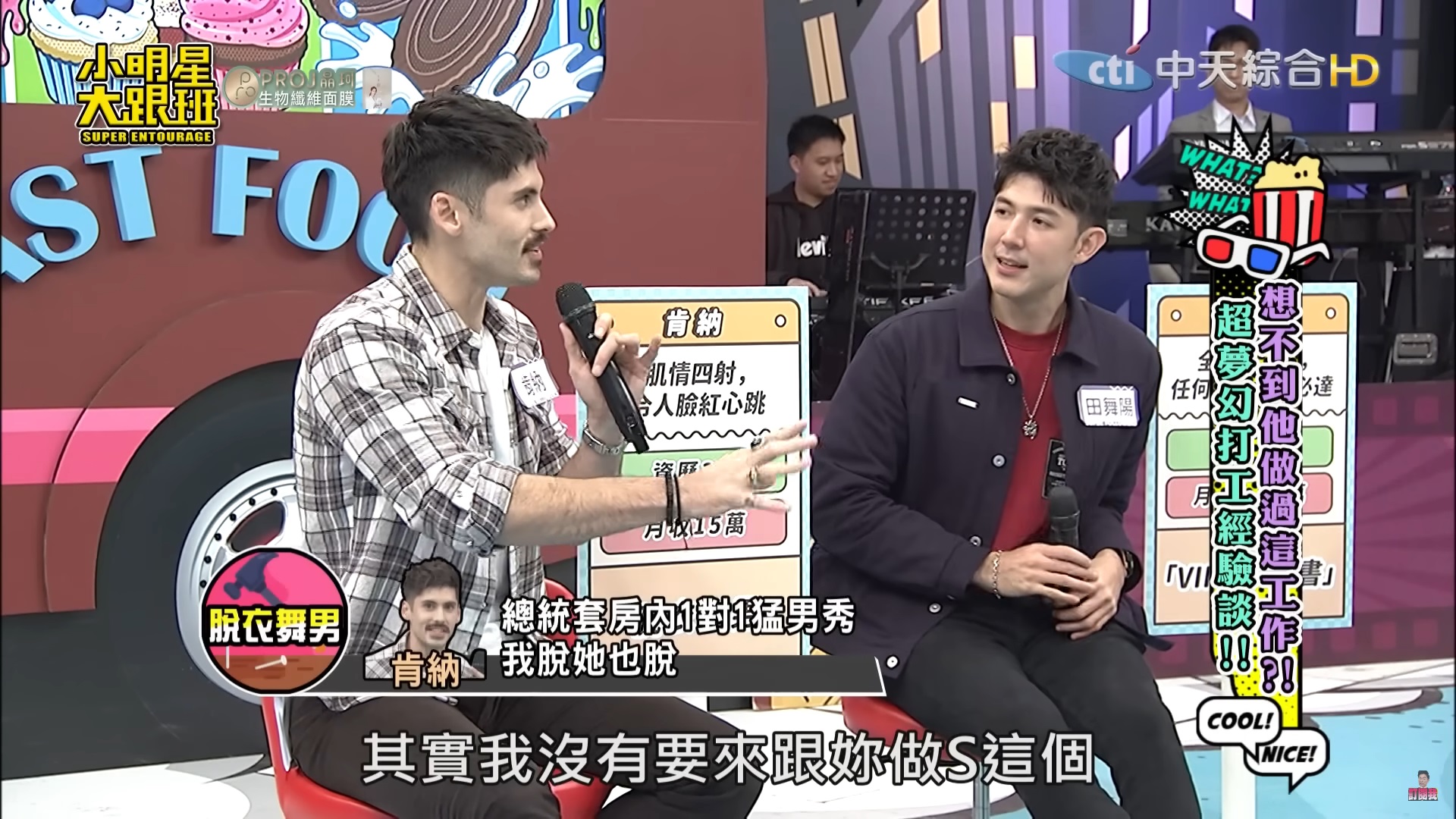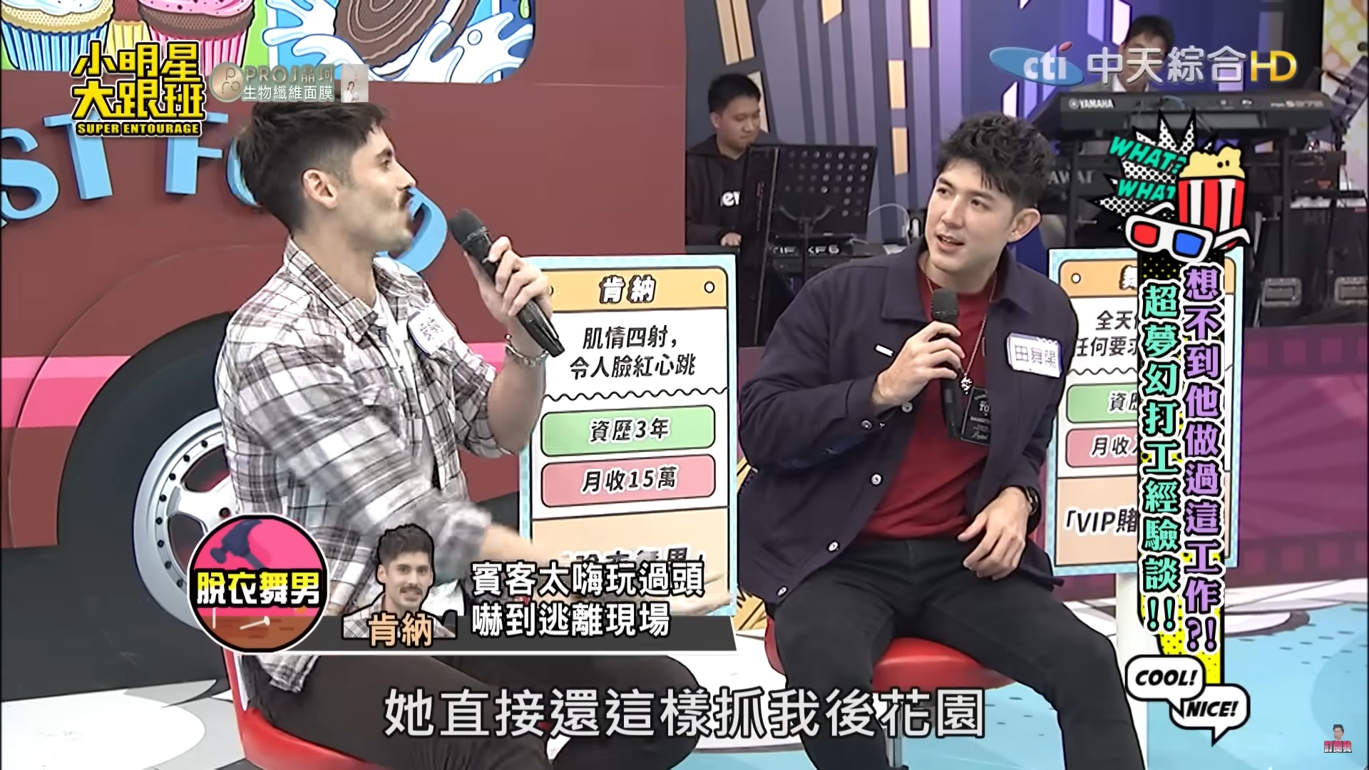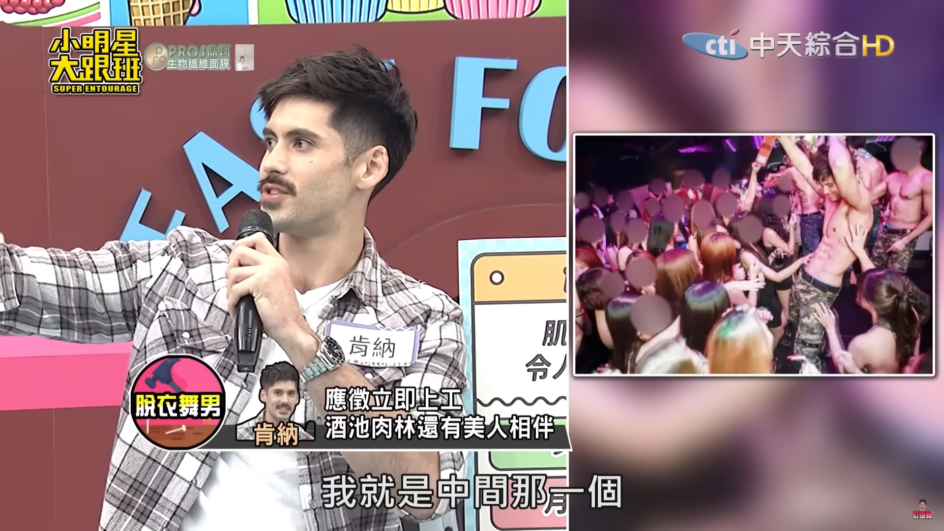 混血男星肯納在台灣發展多年,他日前在節目《小明星大跟班》分享夢幻的工作經驗,透露19歲剛從南非回到台灣時,曾經當過脫衣舞男,當時月收入最高可達15萬。不僅如此,他還自爆曾有一位有錢阿姨花錢請他到VIP總統套房表演,甚至被誤會有提供性服務,所幸他及時阻止才沒有釀成大事。