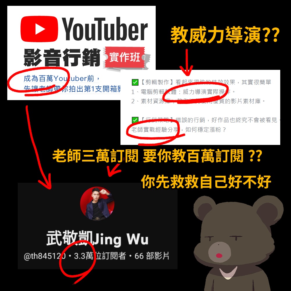 中國文化大學推廣教育部最近請來講師武敬凱以「成為百萬Youtuber前,帶你完成第一支開箱影片」為題,開設影音行銷課程。不過,YouTuber Cheap發現講師頻道的訂閱數只有3.3萬,而且還是教非常初階的剪輯軟體,他直言:「不就是想玩文字遊戲誤導別人,吃YT的豆腐。」對此,武敬凱出面回應了。