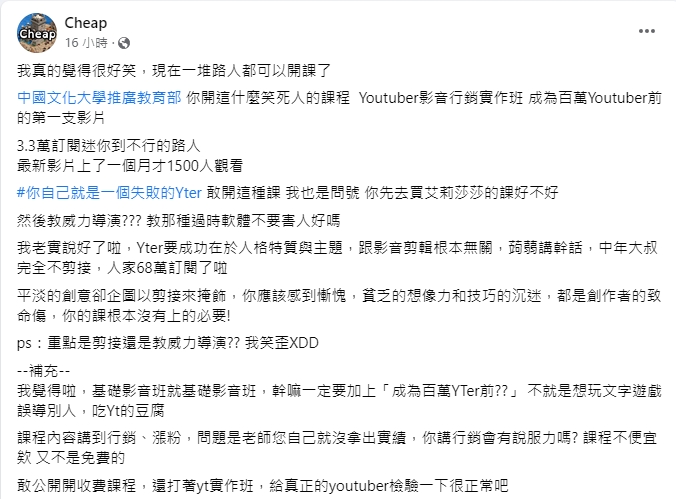 針對文化大學開設的YouTuber影音行銷課程,Cheap 8日在臉書火大表示:「我真的覺得很好笑,現在一堆路人都可以開課了。」認為講師武敬凱的頻道只有3.3萬人,卻主打「成為百萬YouTuber前,帶你完成第一支開箱影片」,甚至最新影片的觀看數都只有1500次,就連傳授的剪輯軟體都早已過時,他直言:「你自己就是一個失敗的YTer,敢開這種課我也是問號。你先去買愛莉莎莎的課好不好!」