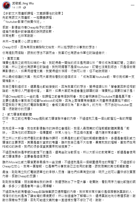 對此,武敬凱表示:「針對文大推廣部課程,文案誤導性的致歉」。透露自己也知道不是訂閱高的YouTuber,只是做商業影像的人,「行銷可以做,但不能說假話」,所以最終才討論出現在大家看到的文案,但是如果會讓人誤會就必須修正。最後,武敬凱坦言雖然一開始看到的時候「有一些心臟爆擊」,但還是很感謝Cheap的反饋,才能立刻修正。