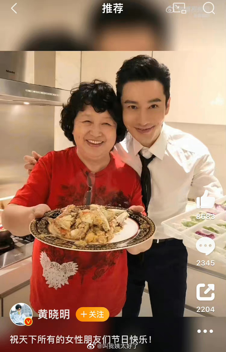 黃曉明在三八婦女節當天,曬出和媽媽在廚房的合照,媽媽對著鏡頭笑開懷,手上還端著家常菜,黃曉明則穿西裝打領帶,露出招牌笑容,然而這張照片卻被眼尖網友發現,媽媽手上端的盤子,曾經在葉珂的照片裡出現過,葉珂在2月初曾發文表示「家宴,月圓人圓事事圓」,當時她拿的盤子和黃曉明媽媽手上的一模一樣。