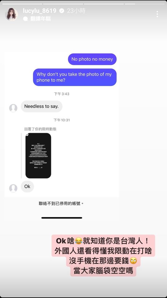 Lucy在報警後,將過程發到IG限時動態上,沒想到對方只回了「Ok」,就直接停用帳號,整個人間蒸發,讓她感到十分荒謬,忍不住截圖嗆聲:「Ok啥,就知道你是台灣人!外國人還看得懂我限動在打啥,沒手機在那邊要錢,當大家腦袋空空嗎?」怒控對方說謊,意外掀起網友熱烈討論。