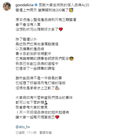 事實上,愛莉莎莎10日宣布成立香氛品牌時,就曾透露「是我從一年半前就開始籌劃的一個生活質感品牌」,會有創業的想法是因為在拍「最貴旅館系列」的過程中,開始萌生把家裡打造成比五星級飯店還舒服的想法,如今終於正式展開計畫,而品牌的理念則是「每一刻,都要記得犒賞自己。」未來會持續以此為目標繼續努力。貼文曝光後,立刻獲得大批網友的支持,如今開出營業額開出紅盤,可見大家都相當支持。