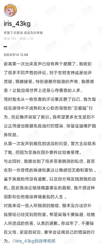 前女友表示,她在上次爆料後,曾有警方主動聯繫,但因為吳瀚在國外,案件比較難受理,與此同時,我接收到了很多惡意揣測的私信,甚至收到一些奇怪的快遞包裹,這讓我感覺無助和害怕。」她強調這段時間都沒有收到吳瀚的道歉,加上網路上的質疑聲浪不斷,讓她決心公開施暴影片。