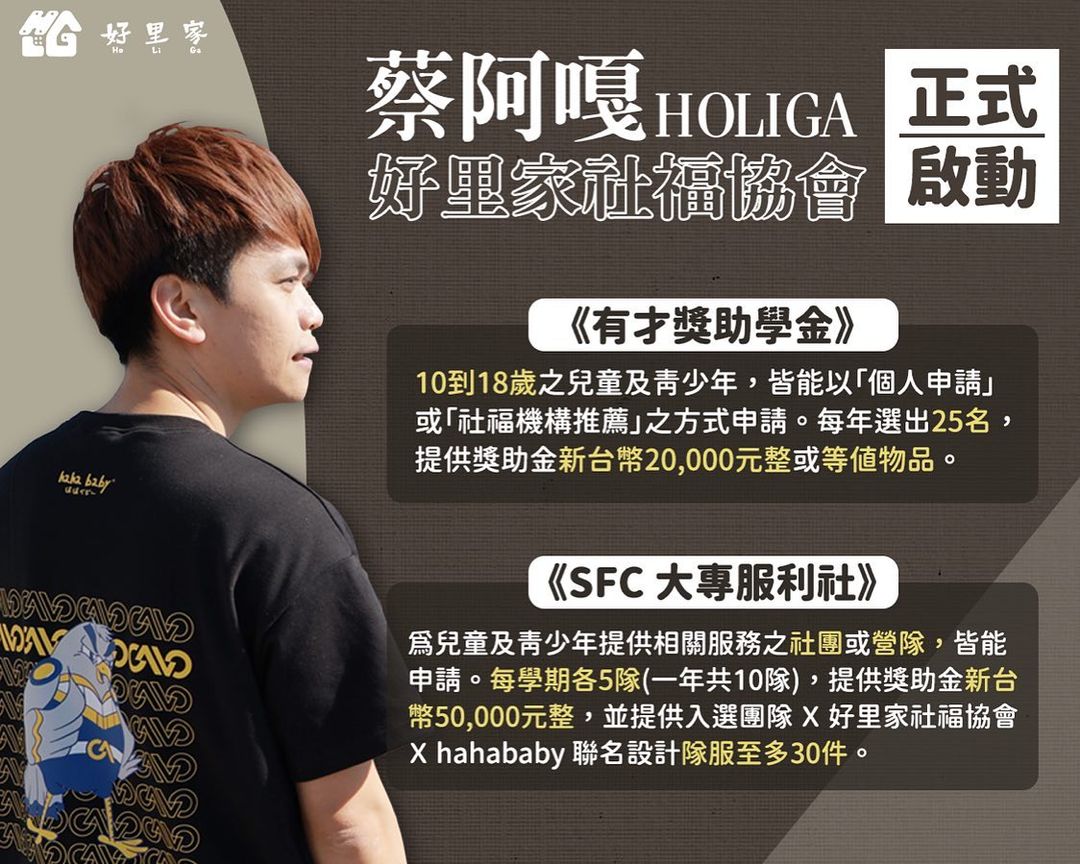 蔡阿嘎透露「臺灣好里家社福協會」將由自己擔任第一任理事長,會成立社福單位「絕對不是洗錢」,何況通常是賠錢。而協會幫助的對象與其他單位比較不一樣,不一定要家境清貧、成績優異,只要有才華欠栽培就可以申請。今年還將推出兩大年度計畫,分別是《有才獎助學金》跟《SFC大專福利社》,前者服務的對象是10到18歲的兒少,最後會選出25位,提供新台幣2萬元或是等值商品。他直言社福資源有限,只能給最弱勢的人,但是個案如果真的很值得服務,就可以找「好里家」幫忙。