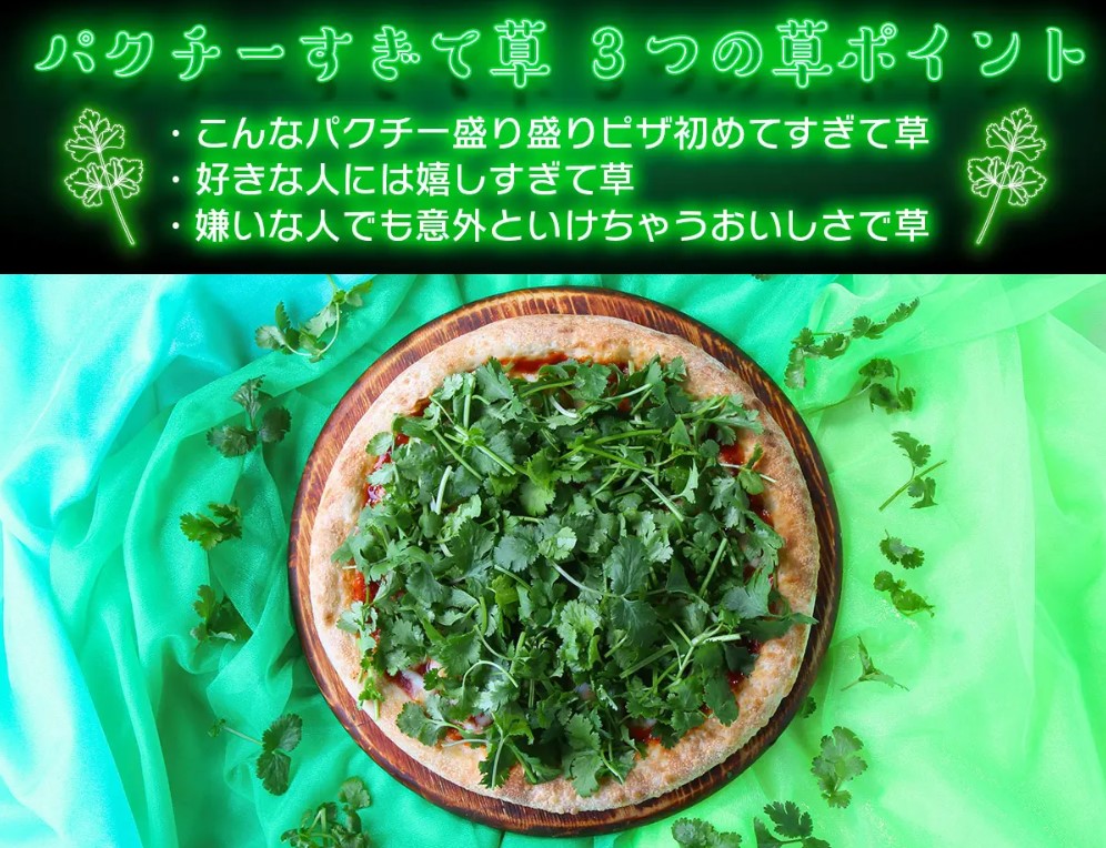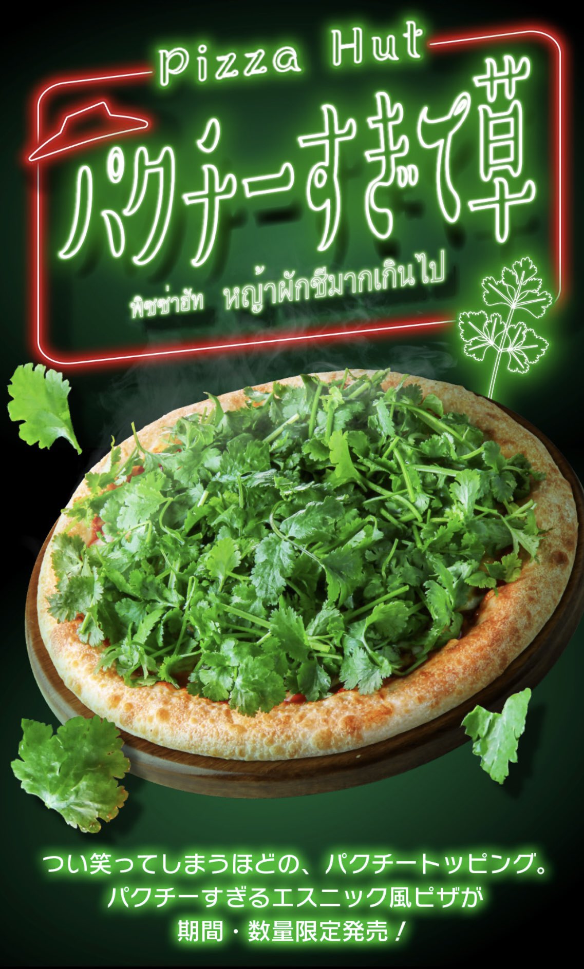 綜合日本媒體報導,必勝客最近推出了一款名叫「太多香菜」的披薩(パクチーすぎて草),雖然因香菜的味道強烈,在料理中屬於配角並少量使用,但這款披薩卻是顛覆傳統觀念,將香菜作為主角,一次用上3棵香菜並在下方佐以番茄醬、辣醬並配大蝦,官方也配合一向主打的口號直言這是一款在視覺和味覺上都「超乎想像」的披薩!
