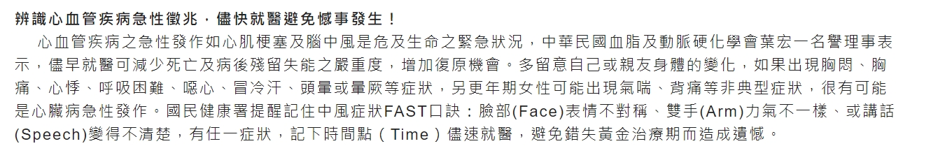 而根據國健署提供的資料指出,心肌梗塞常見的前兆有「胸悶、胸痛、心悸、呼吸困難、噁心、冒冷汗、頭暈或暈厥等症狀,另更年期女性可能出現氣喘、背痛等非典型症狀」,如果有出現上述症狀就要立即就醫,以免憾事發生。