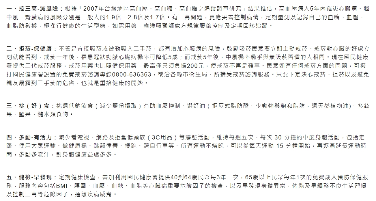 不僅如此,平時都可以透過好的健康習慣去預防,包含「控三高(高血壓、高血糖、高血脂)」、「拒菸」、「挑好食」、「多動」及「健檢」。由於有三高患者比一般人罹患心臟病、腦中風、腎臟病的風險還高,所以更應該妥善控制病情;也可透過最基礎且良好的生活習慣保護身體,減少心臟損傷的可能性。