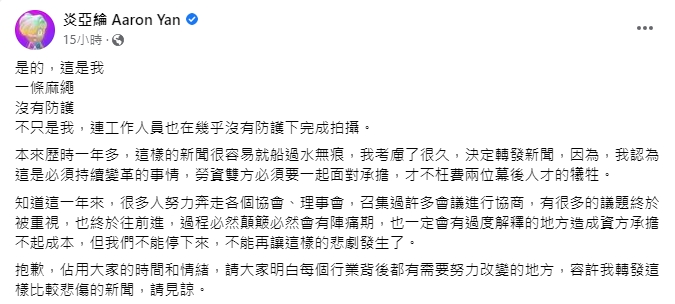 炎亞綸表示事件發生至今已經一年多,而這類的新聞事件很容易被大眾遺忘,「我考慮了很久,決定轉發新聞,因為,我認為這是必須持續變革的事情,勞資雙方必須要一起面對承擔,才不枉費兩位幕後人才的犧牲。」這段時間,很多人為了改革努力奔走,使得很多議題獲得重視以及能夠前行,即使會有很多的難關,「但我們不能停下來,不能再讓這樣的悲劇發生了。」