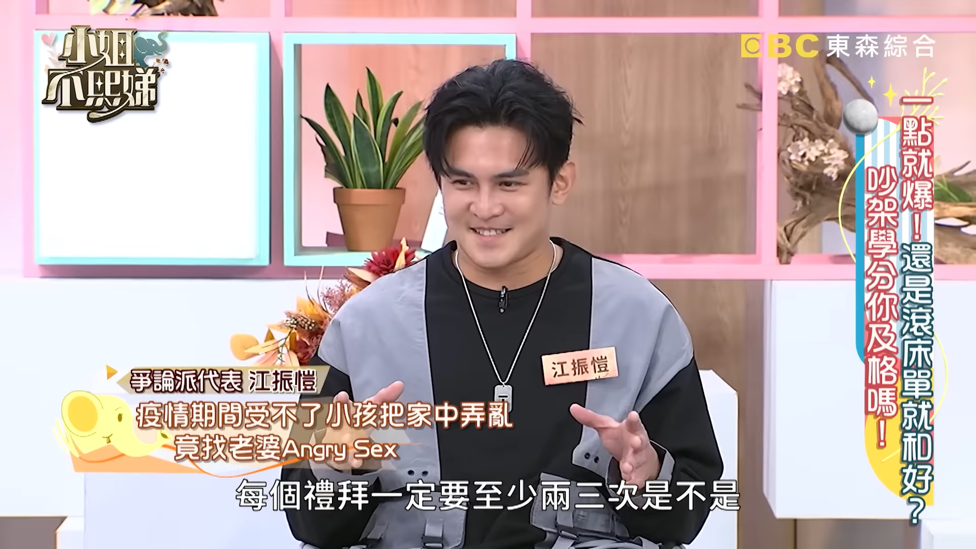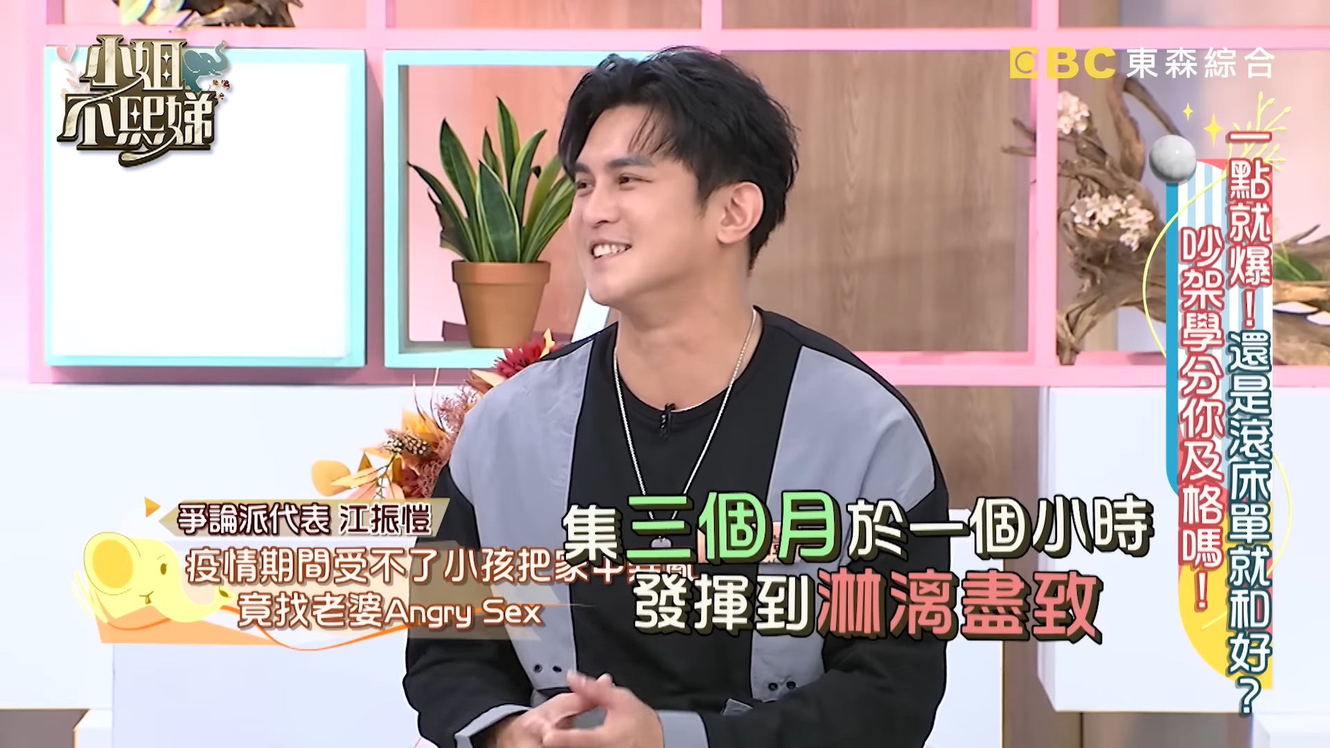 薔薔在節目中表示:「再無趣的人都要嘗試一個叫做『Angry sex』,Angry sex適用於真愛」,不夠愛反而無法進行,但小S則認為「結婚久了,不會有Angry sex」,沒想到江振愷竟自爆去年曾發生過一次。他透露當時因為疫情而被關在家,自己是一個愛乾淨的人,但小孩卻把家裡搞得亂七八糟,因此經常把他惹毛,再加上他是一個性需求大的人,正常頻率是每周至少要跟老婆行房兩三次,但這段期間小孩跟媽媽都在家,讓他無處發洩,苦上加苦!