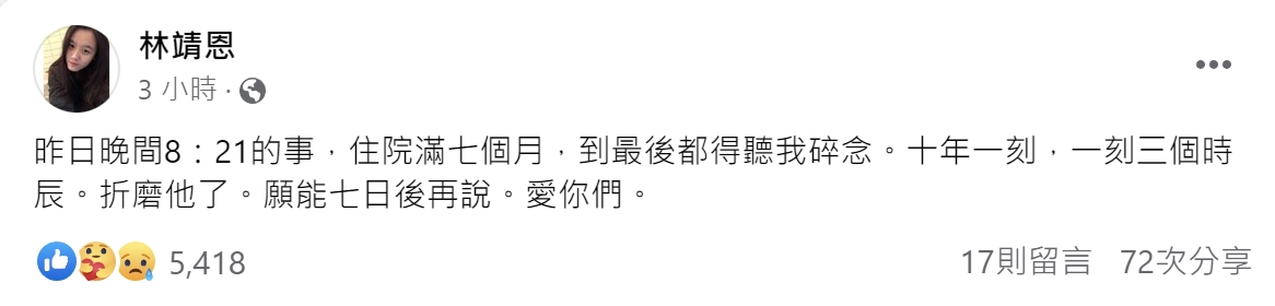林靖恩9日晚間發文證實李坤城離世消息,她心痛表示:「昨日(8日)晚間8:21的事,住院滿七個月,到最後都得聽我碎念。十年一刻,一刻三個時辰。折磨他了。願能七日後再說。愛你們。」