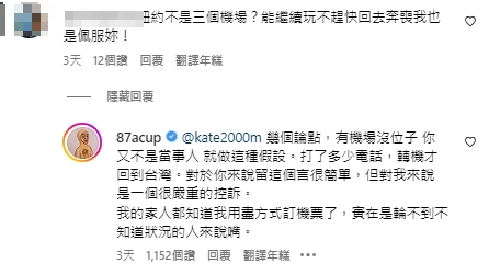 怎料貼文曝光後,竟有網友怒批:「紐約不是三個機場?能繼續玩不趕快回去奔喪我也是佩服妳!」對此,白癡公主嚴肅地說:「幾個論點,有機場沒位子,你又不是當事人,就做這種假設。打了多少電話,轉機才回到台灣。對於你來說留這個言很簡單,但對我來說 是一個很嚴重的控訴。我的家人都知道我用盡方式訂機票了,實在是輪不到不知道狀況的人來說嘴。」她隨後將留言轉發至限時動態並表示:「身為創作者,拍影片就是我的工作,不是在玩樂。」也很謝謝關心自己的朋友們。