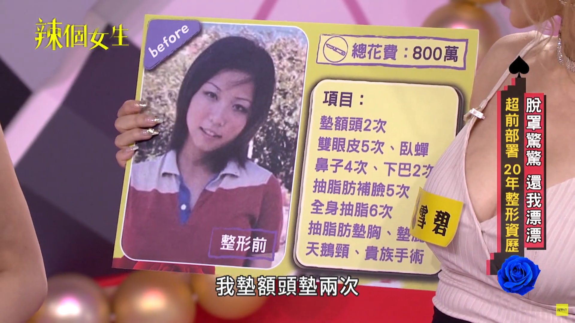 雪碧在節目中透露總共做了11項整形手術,包含墊額頭2次、雙眼皮5次、臥蟬、鼻子4次、下巴2次、抽脂肪補臉5次、全身抽脂6次、抽脂肪墊胸、墊屁股、天鵝頸及貴族手術,其中還不包含醫美療程、肉毒等,花費高達「800萬」!對此,主持人小煜好奇詢問:「為什麼要做那麼多次鼻子?」她表示因為隨著時間的流逝,鼻子內注射的東西可能會被吸收,或是歪掉,所以必須不斷調整。