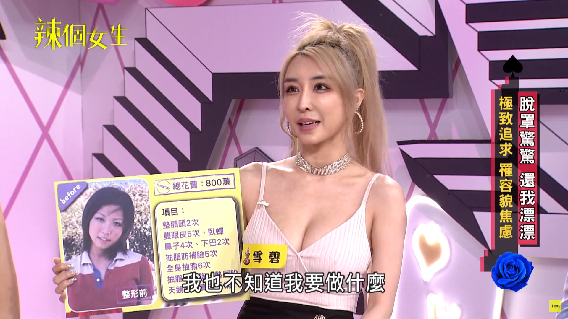 不僅如此,雪碧坦言有嚴重的容貌焦慮症,「我一個月沒有去醫院打玻尿酸或打肉毒,就覺得渾身不舒服。」甚至跟醫師諮詢的時候,還是不知道該調整哪個部位,最後只好硬找個地方處理,「出來花個錢我就開心了!」不過,她認為整形沒辦法一次到位,也需要不斷調整才能維持在最完美的狀態,這也是為什麼同樣的手術會動這麼多次、花這麼多錢的原因。