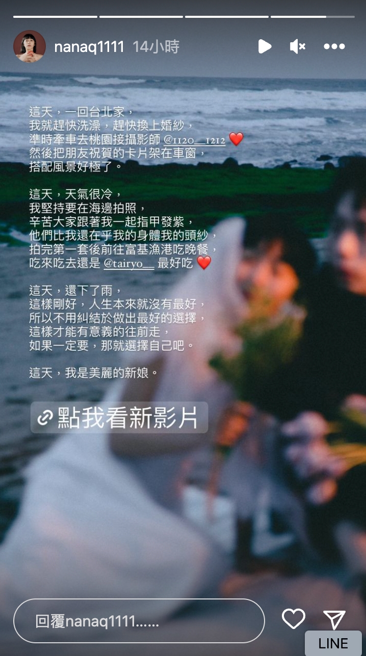 NanaQ事後還在IG分享拍攝當天的故事,透露一回到台北老家就趕快換上婚紗,接著就開車去接攝影師時,還把朋友給的祝賀卡片放在車窗上,搭配沿路美好的風景,畫面相當好。雖然當時天氣很冷又下雨,但她還是堅持要在海邊拍照,她表示:「人生本來就沒有最好,所以不用糾結於做出最好的選擇,這樣才能有意義的往前走,如果一定要,那就選擇自己吧。」