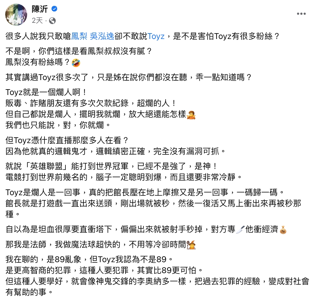 針對有人認為陳沂不敢嗆Toyz一事,她透露自己其實說過很多次,更直言:「Toyz就是一個爛人啊!販毒、詐賭朋友還有多次欠款紀錄,超爛的人!」但是因為他很會自嘲,導致旁人說再多都已經沒有攻擊性。至於Toyz的直播為什麼這麼多人看,陳沂認為是因爲他的邏輯縝密正確,「完全沒有漏洞可抓」。
