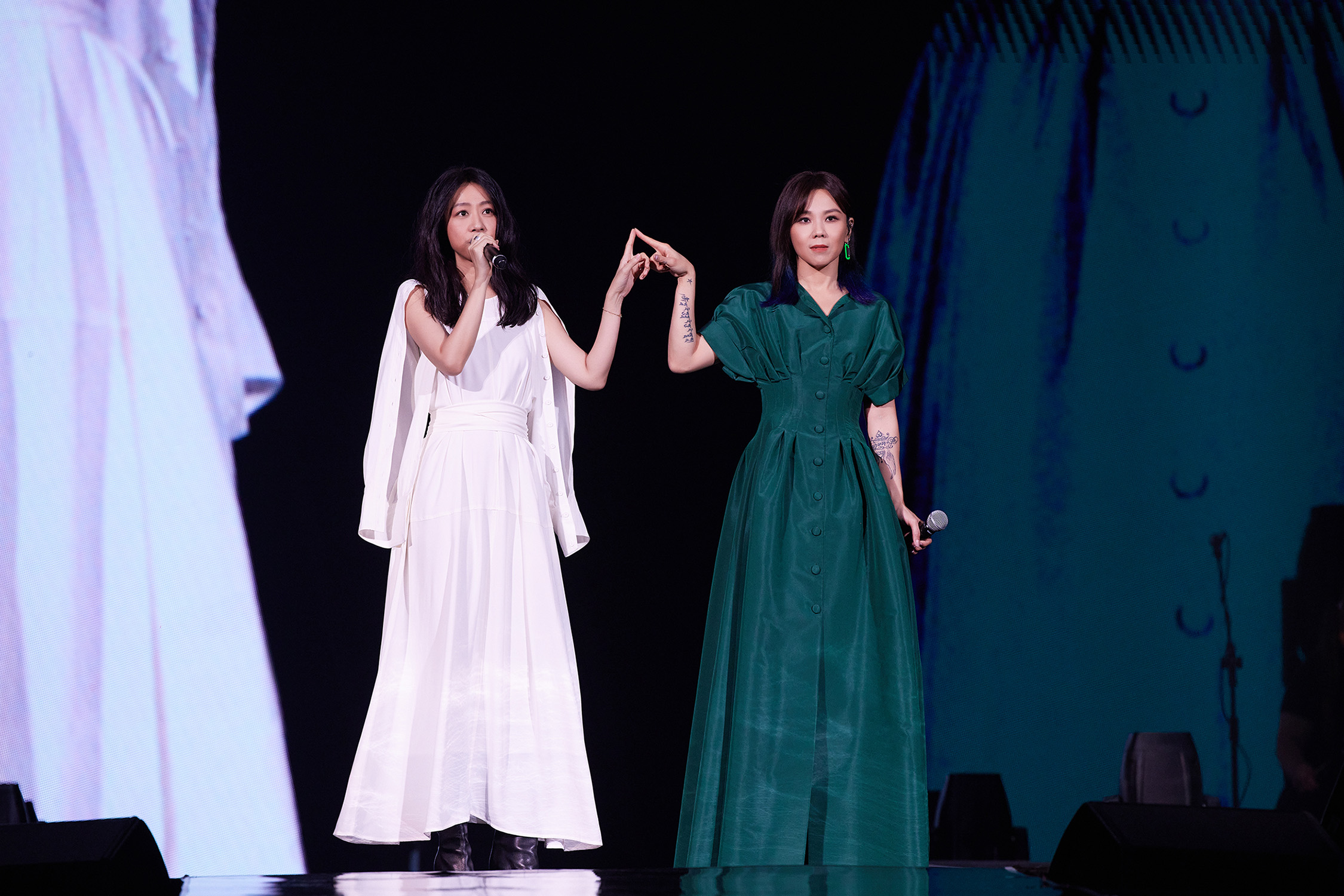 此外,Tanya也透露在討論演唱會嘉賓時,大家討論來討論去都沒一個結論,會議中場休息時,她走到後陽台, 突然就福至心靈,聽到宇宙在呼喚她,宇宙跟蔡健雅說:「綺貞當嘉賓。」當下跟大家提出,也獲得全場一致同意後,蔡健雅就立刻發出邀請,也得到綺貞很快速的答應,促成樂壇一大佳事!她也覺得緣分很奇妙,和陳綺貞第二次同台竟然要23年,更難得的是,幽默稱彼此是上個世紀創作歌手的蔡健雅,不忘讚許好友跟自己「在這個世紀也都還在」,屹立不搖,且仍對音樂充滿熱情,當場對萬名樂迷喊話:「要多多珍惜我們兩位創作資深美少女呦!」此外,陳綺貞今晚身穿白色長洋裝,跟穿著綠色長洋裝的蔡健雅站在一起宛如女團,兩人還無預警小跳一段BLACKPINK團員Jisoo《FLOWER》的開花舞,掀起空前高潮!