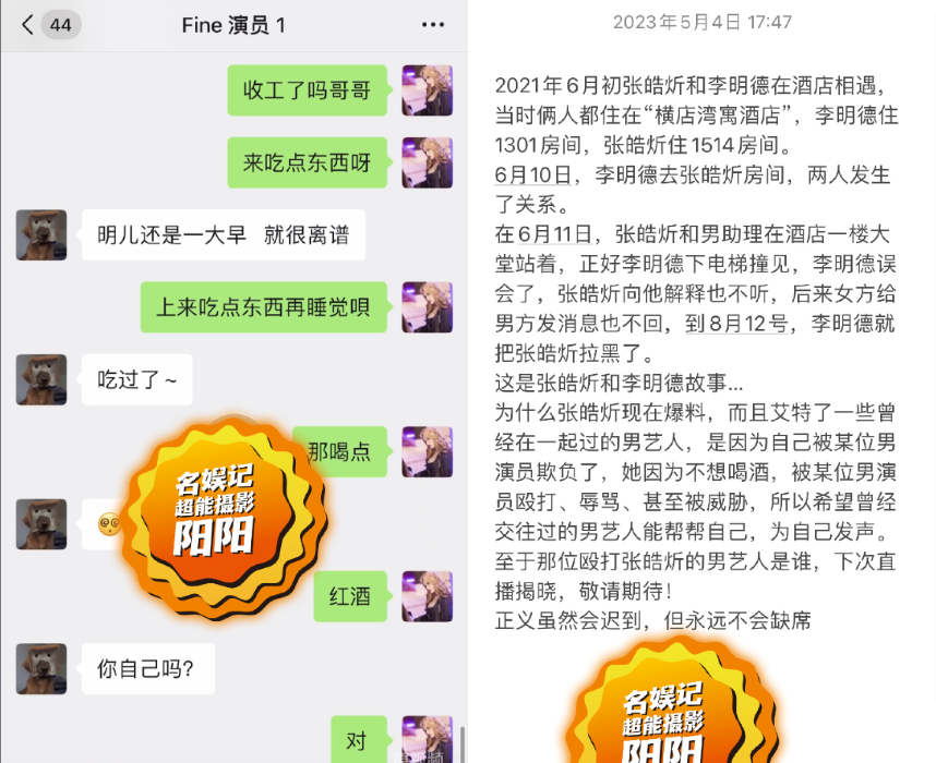 張皓炘日前在微博透過狗仔直播爆料,去年6月在酒店邂逅李明德,他們越走越近,10日兩人在女方房間發生關係,沒想到隔日張皓炘和助理在酒店大廳卻被李明德撞見,李明德因此將她所有的通訊軟體封鎖,疑似借題發揮,而張皓炘會選擇爆料,是因為自己被某位男演員欺負,當時她不想喝酒,遭對方毆打辱罵,因此希望和自己交往過的男星能用自己的力量幫忙發聲。