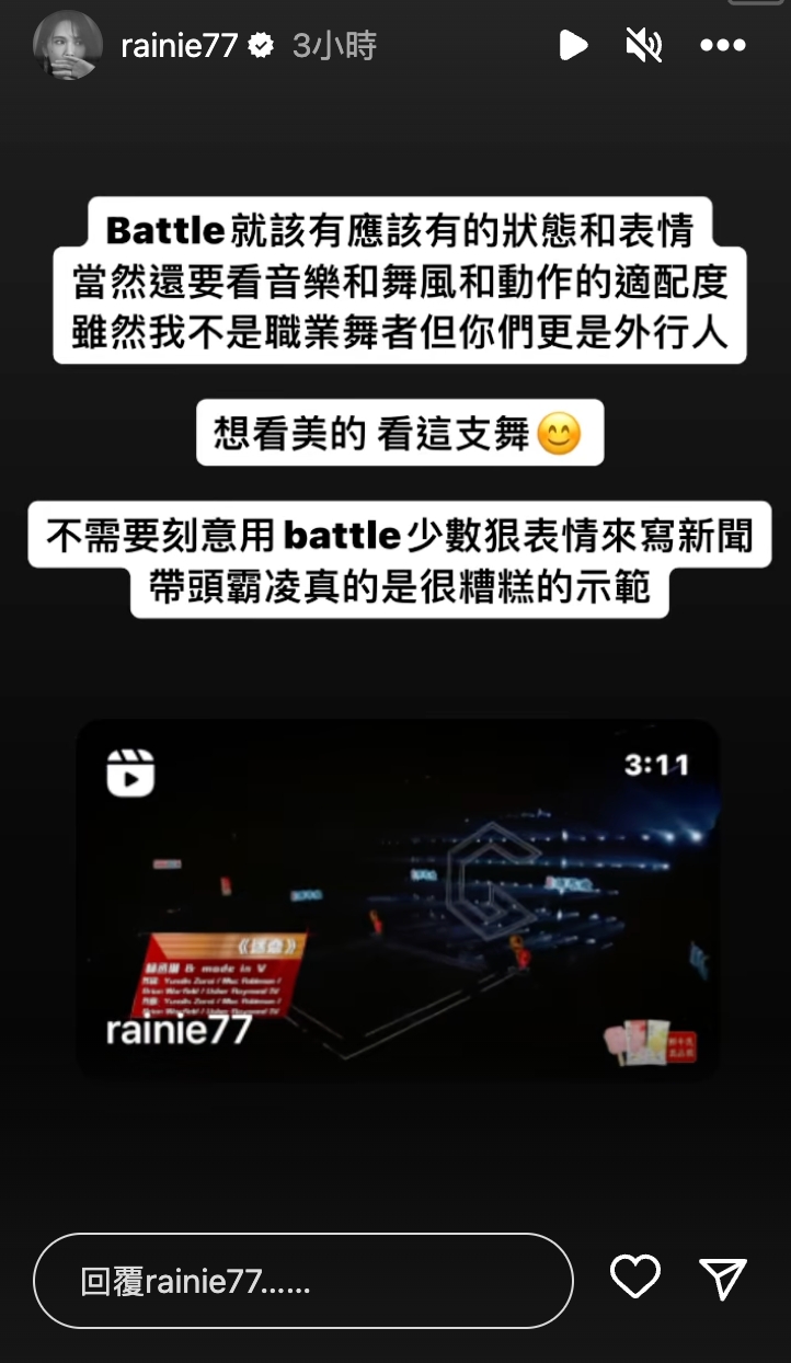 楊丞琳最近在不少節目有舞蹈演出,她也樂於在社群平台分享,但是卻因為「用力的表情」而遭到議論,對此,她9日透過IG限時動態火大表示:「Battle 就該有應該有的狀態和表情,當然還要看音樂和舞風和動作的適配度,雖然我不是職業舞者但你們更是外行人。」雖然自己有不少需要張力的表演,但還是有溫柔的演出,認為大家不需要用狠表情製造話題,她直言:「帶頭霸凌真的是很糟糕的示範。」