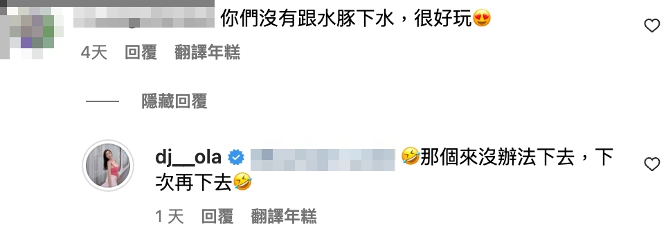 不過,歐菈日前分享到墾丁農場與水豚一起玩的照片時,有網友詢問:「你們沒有跟水豚下水,很好玩~」她表示:「那個來沒辦法下去,下次再下去。」如果不是舊照片的話,肚子應該還是很平靜。