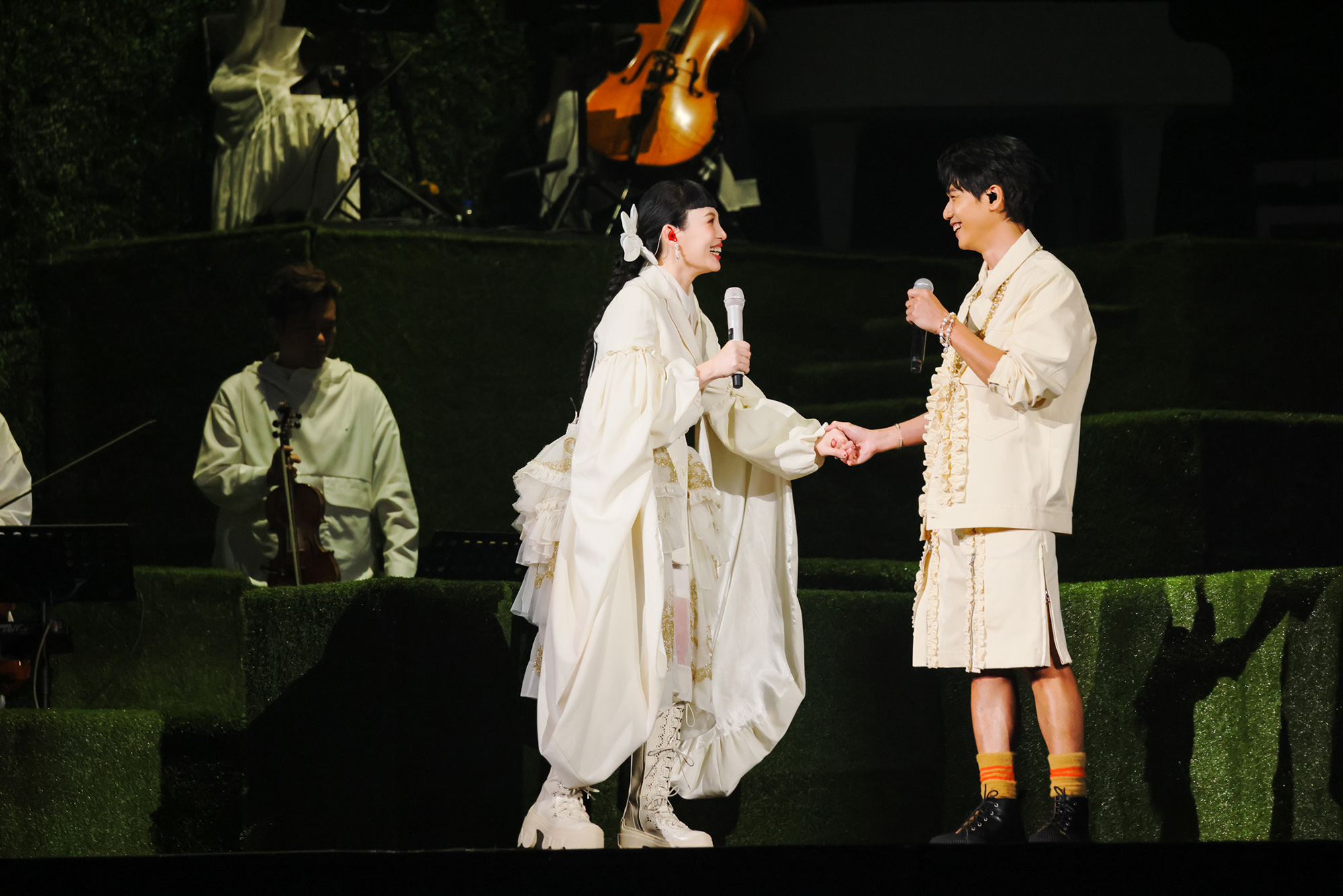 Simone Rocha 亦是魏如萱經常穿著的愛牌,摩登、強勢、浪漫是品牌的風格代表,設計師擅於利用大量柔性元素如珍珠、蕾絲、荷葉邊、刺繡、烏干紗融入看似衝突的量感廓型設計,浪漫柔美的風格中同時滲入剛毅個性,被譽為暗黑美學的代表。魏如萱《HAVE A NICE :DAY 2 YOU》台北站首場嘉賓迎來好友蔡旻佑(Evan Yo),兩人一連合唱《被雨傷透》、《星期三或禮拜三》兩首華麗曲目,音樂劇《向左走向右走》去年巡演即宣布不再演出的男女主角安可合體並加碼帶來一段舞台劇男女主角相識經典橋段演出,此外,魏如萱在演唱「買買組曲」時,加碼挑戰朱碧石(小豬羅志祥)的《買冬瓜》,她奮力與兩位正宗朱碧石男舞者豔麗登場載歌載舞,讓全場叫好連連,掀起空前高潮!魏如萱《HAVE A NICE :DAY 2 YOU》演唱會明(14日)將連莊邁進第二場,樂迷千萬不要錯過!