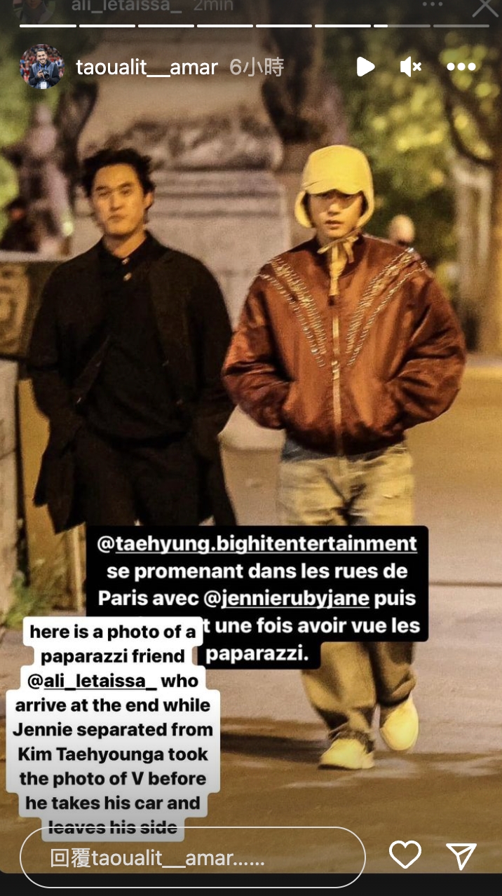 Jennie跟V疑似在法國約會的影片在網路上瘋傳,只見兩人一身輕便,親密地牽著手散步,雖然沒有刻意喬裝,但是因為兩人都戴著帽子,再加上拍攝距離有點遠,所以無法看清楚臉。不過,由於V在法國有拍攝,Jennie則是將出席22日的坎城影展,時間點不謀而合,再加上有眼尖的網友根據服裝發現,身後遠遠跟著的人就是雙方的經紀人,許多證據都證實了雙方的身份。