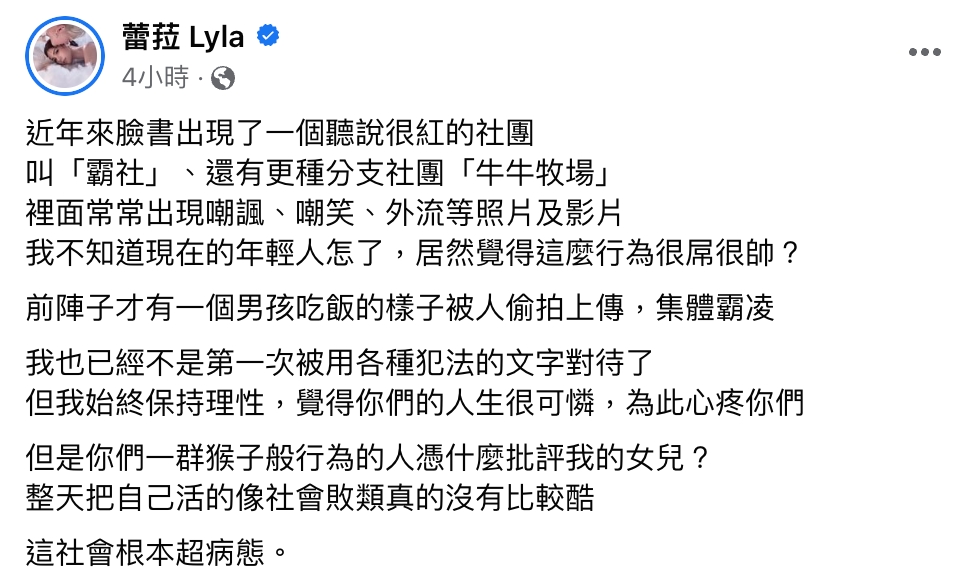 蕾菈19日在臉書透露和女兒的照片被放到社團上,慘遭眾人開砲,她無奈表示:「裡面常常出現嘲諷、嘲笑、外流等照片及影片,我不知道現在的年輕人怎了,居然覺得這麼行為很屌很帥?」前一陣子才發生有一個男生吃飯的樣子被偷拍上傳,反而遭到集體霸凌。她表示自己不是第一次被酸民攻擊,但始終寶理性,「覺得你們的人生很可憐,為此心疼你們,但是你們一群猴子般行為的人憑什麼批評我的女兒?」更氣炸直言:「整天把自己活的像社會敗類真的沒有比較酷,這社會根本超病態。」