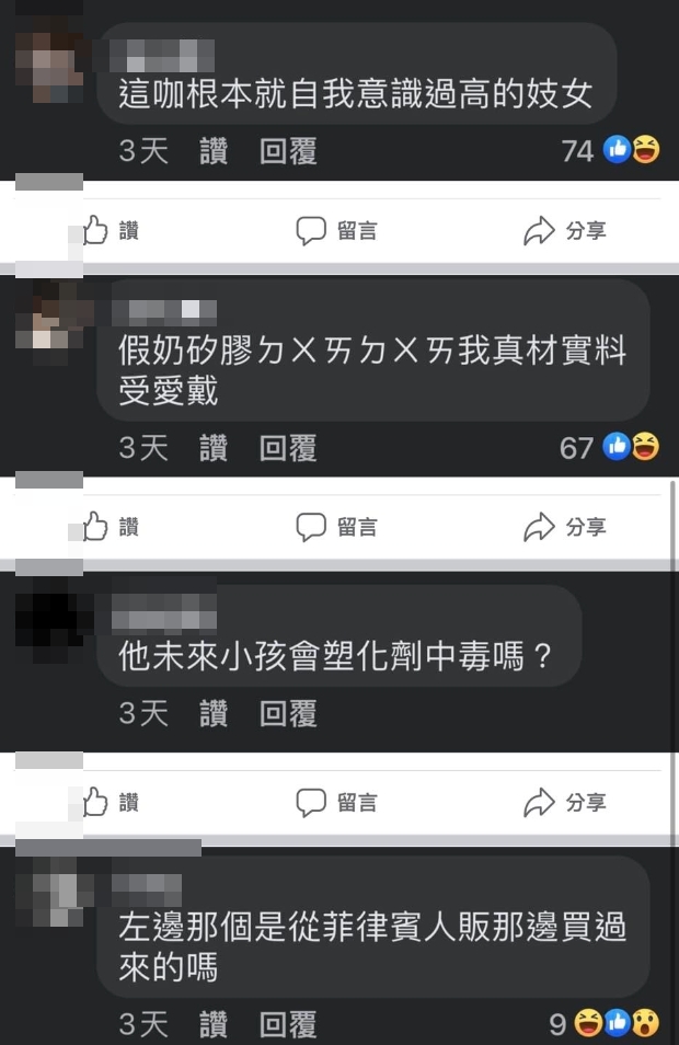根據蕾菈截圖可以發現,網友表示:「這咖根本就自我意識過高的妓女」、「她未來小孩會塑化劑中毒嗎?」滿滿的人身攻擊。更過分的是,還有人嗆蝶蝶,「左邊那個是從菲律賓人販那邊買過來的嗎?」用詞相當不客氣,也難怪讓身為媽媽的蕾菈會氣到公開網友的臉書帳號。