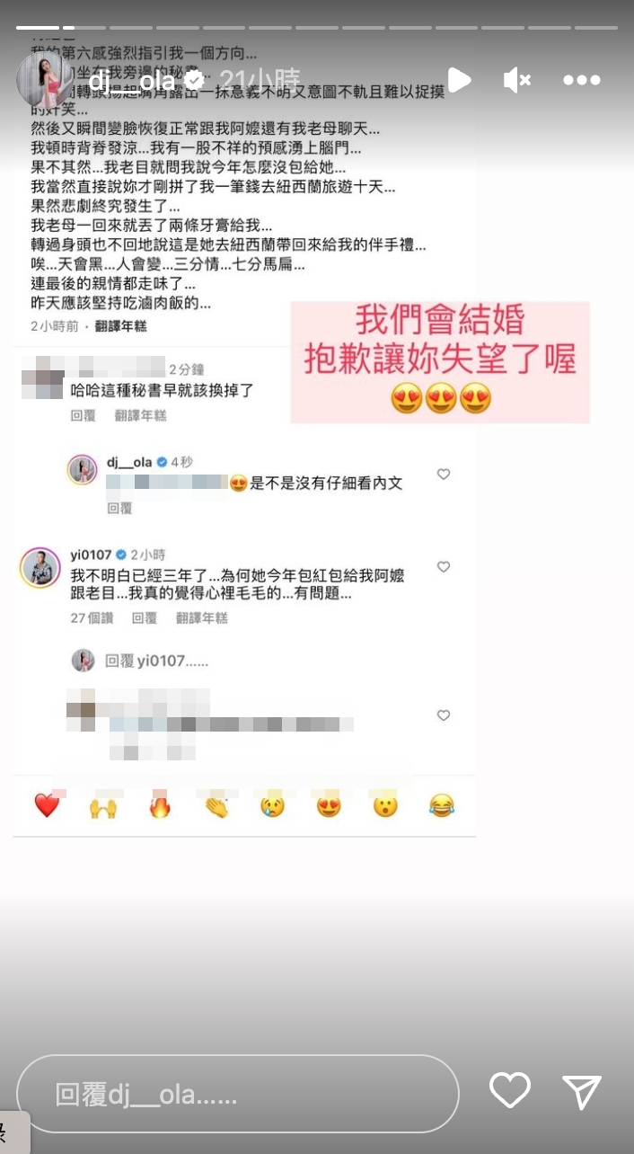 原本只是玩笑話的內容,沒想到卻有網友認真看待並表示:「這種秘書早就該換掉了」,歐菈第一時間就回應:「是不是沒有仔細看內文」,還將留言截圖並公開回嗆:「我們會結婚,抱歉讓妳失望了喔~」一席話證實兩人已經有計劃步入婚禮,而非只是猜測。