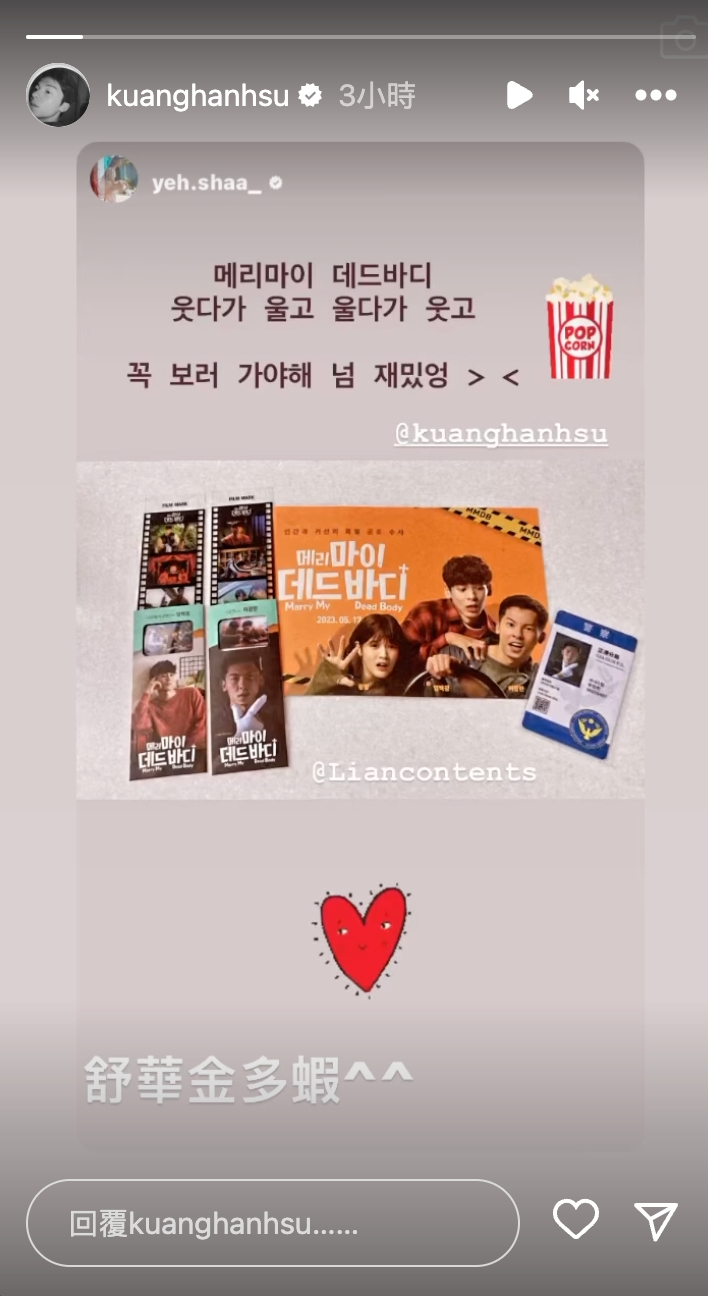 葉舒華23日在IG曬出《鬼家人》的周邊,並分享看完電影後的心得:「看《鬼家人》笑到一半會哭,哭到一半會笑,一定要去看,真的很有趣!」還在最後標記許光漢的帳號。對此,許光漢24日轉發該則動態並幽默回應:「舒華金多蝦(很謝謝)」,男神、女神夢幻連動的場景,讓人感到不可思議。