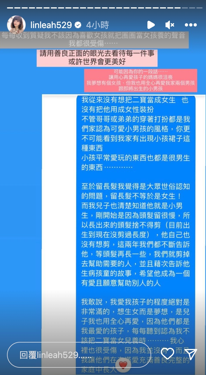 對此,有網友認為林舒語因為想要生一個女兒,所以故意把二寶當成女生養,她難過表示:「可能因為你的一段話,讓用心在愛孩子的媽媽很沮喪。我夢想有個女孩,但我也用全新在愛我家兩個男孩跟即將出生的小男孩。」從回覆網友的訊息中可以看到,她澄清:「我從來沒有想把二寶當成女生,也沒有把他用成女性裝扮」,兩個小孩的穿著都是他們認為的可愛小男孩風格,家裡甚至沒有裙子,平常的玩具還是普遍男生喜歡的東西。