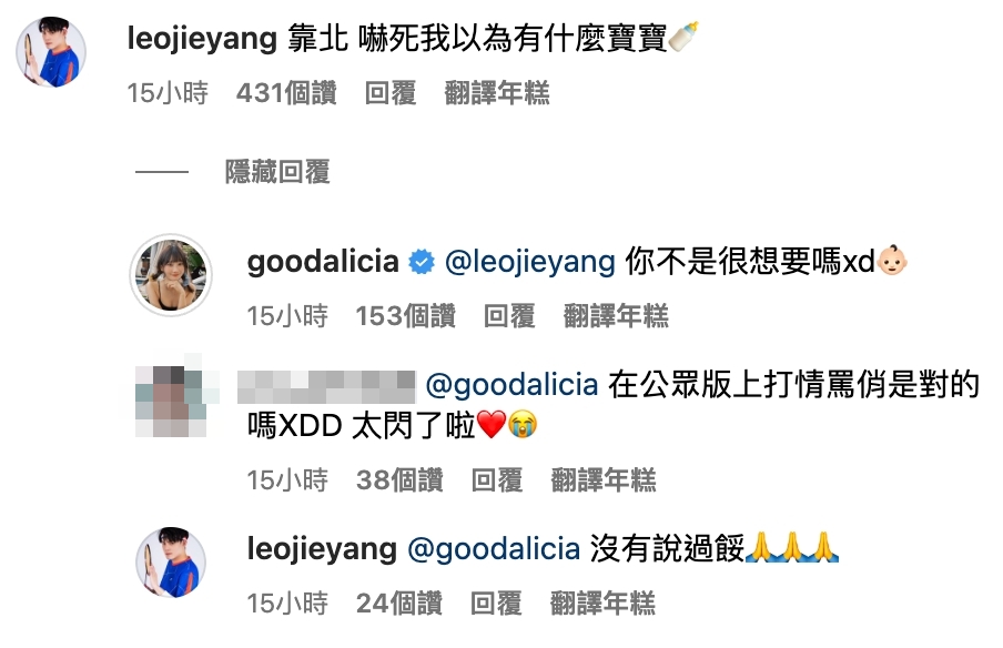 貼文曝光後,大家紛紛刷起一排「生日快樂」之外,還有許多人驚呼:「嚇死!昨天才在打羽球,想說居然!」、「第一眼看到寶寶有誤會、震驚了一下」、「還以為你懷孕了」,就連男友都現身留言區表示:「靠北,嚇死我以為有什麼寶寶」,愛莉莎莎回覆:「你不是很想要嗎?」他見狀趕緊澄清:「沒有說過餒!」一來一往有的有趣互動讓網友全都笑翻。