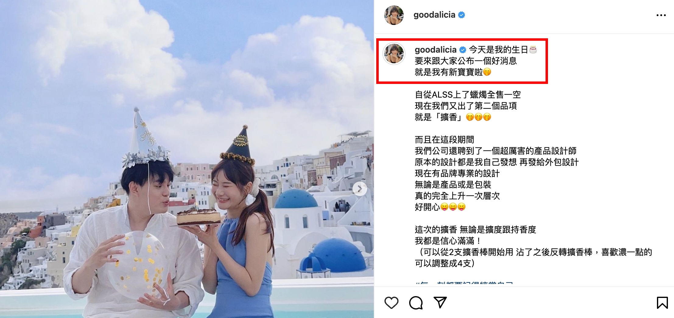 25日正是愛莉莎莎的31歲生日,沒想到她竟然宣布:「今天是我的生日,要來跟大家公布一個好消息,就是我有新寶寶啦~」突如其來的消息讓大家都嚇了一跳,但接著看內文才發現,原來只是自創的香氛品牌推出新產品!