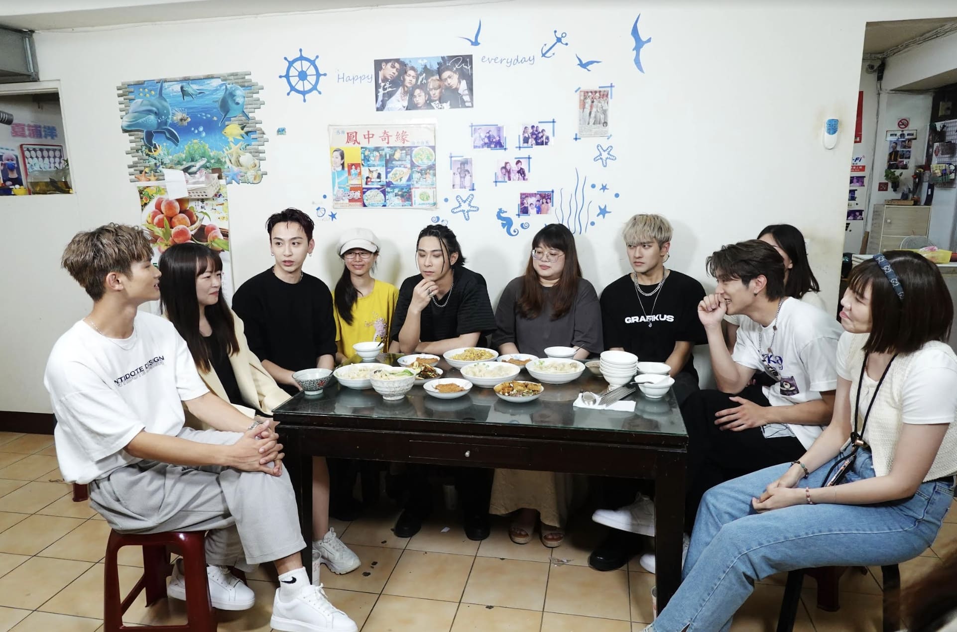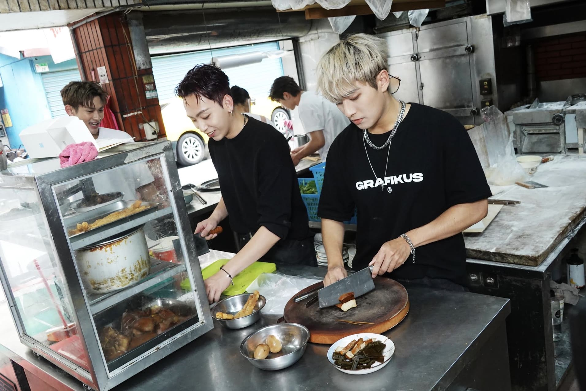 此次獻給粉絲的午餐時間則選在浦洋家歷史已超過30年的老字號麵店「糊塗麵」,過程中更由浦洋的爸媽「坐鎮」,隨時監督出餐品質,而FEniX則由包餃子開始,從桿麵皮到包餡料...等步驟都得親自參與,浦洋熟練的模樣,也讓大家深感佩服,他分享道:「還在唸書的時候就會在家裡幫忙,但怎樣都比不過我媽,每次我才包了一排,我媽已經包了快100顆了!」透露平均一小時竟可產出1,000顆生水餃!而成員們也自由發揮包起獨有的水餃形狀,為了讓粉絲都能吃得盡興,甚至肉餡多到一度包成「小籠包」!此外,MAX也挑戰大火快炒專屬「黃金炒飯」,不到五分鐘就被廚房熱得滿身大汗,直呼在廚房的工作人員們相當辛苦;而峻廷、家齊則親自為粉絲切小菜、炸排骨,挑戰油鍋及刀工。