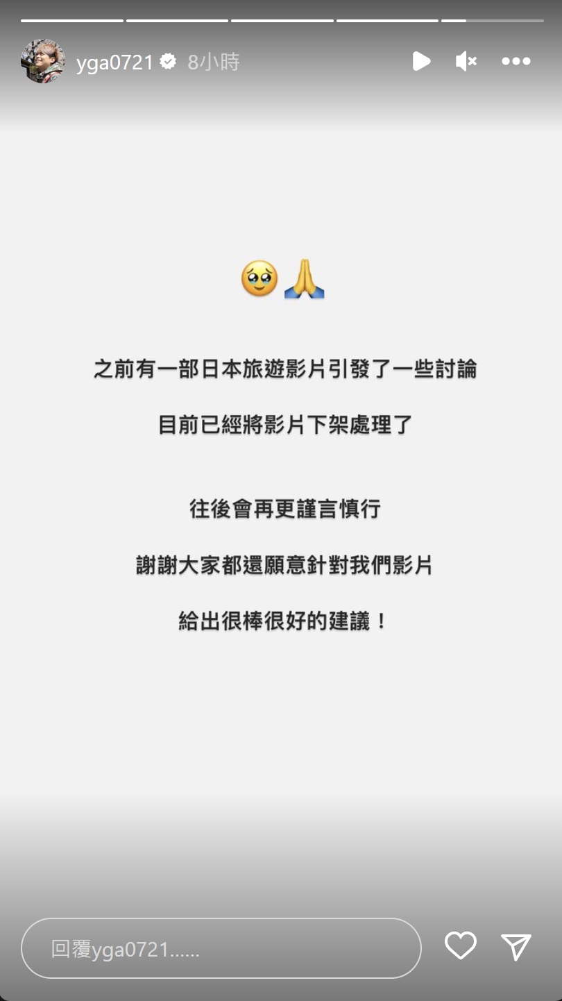 對此,蔡阿嘎立即將影片下架並透過IG限時動態道歉:「往後會更謹言慎行,謝謝大家都還願意針對我們影片給出很棒、很好的建議!」