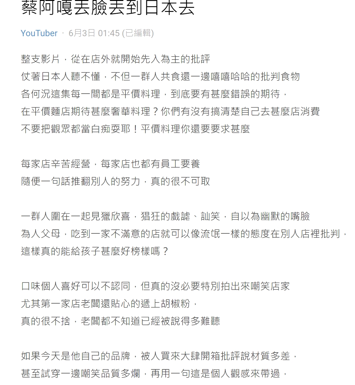 蔡阿嘎日前在頻道上傳「日本5家超難吃的連鎖地雷店」的影片,但是影片中的態度及行為立刻引起網友們的不滿,有網友在Dcard發文怒斥,「整支影片,從在店外就開始先入為主的批評,仗著日本人聽不懂,不但一群人共食,還一邊嘻嘻哈哈的批判食物,更何況這集每一間都是平價料理,到底要有什麼錯誤的期待?」原PO認為每家店都是辛苦經營,也有員工要養,「隨便一句話推翻別人的努力,真的很不可取。」
