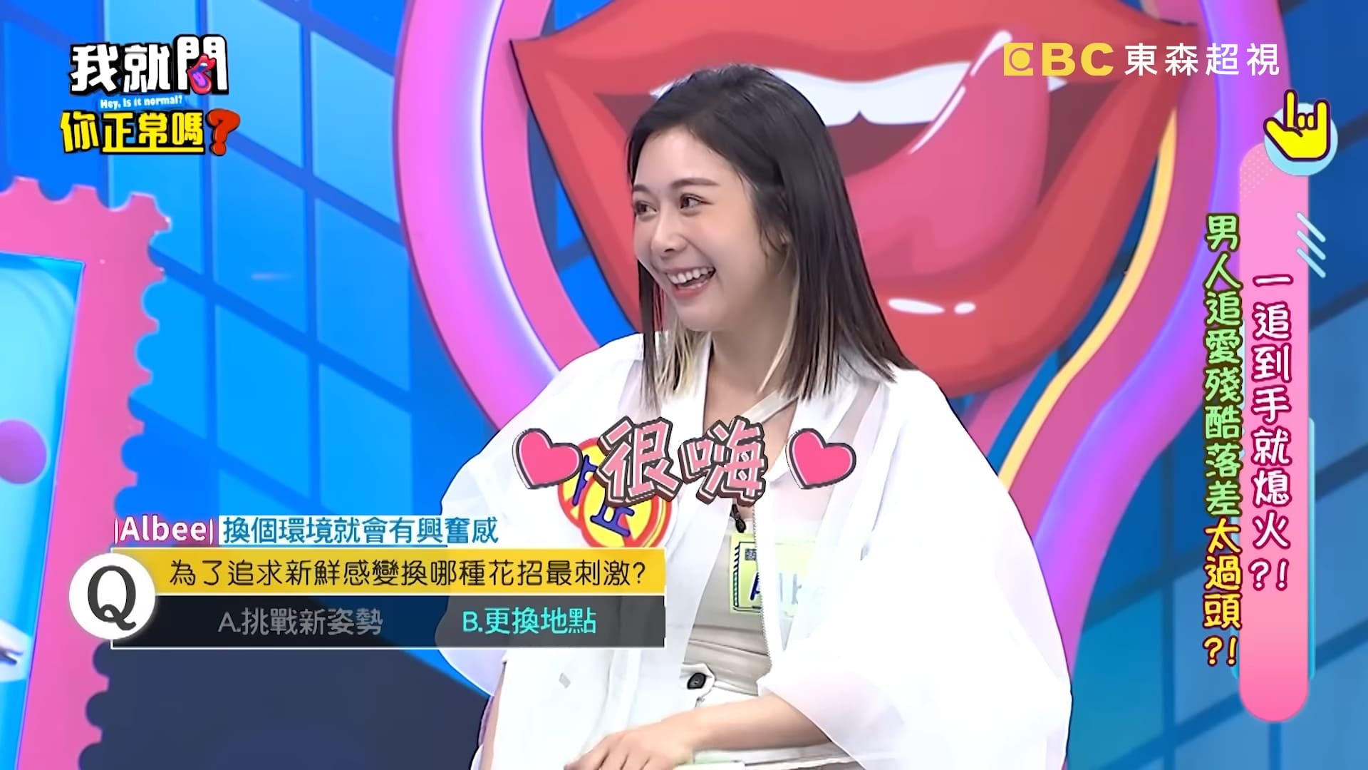 關於如何維持床事新鮮感,Albee認為不一定要在外面,如果環境挑選不好會興致缺缺,也會沒有安全感,反而是可以選擇在家裡房間以外的地方,「會讓人有興奮感」。她自爆曾跟男友在廚房的流理台進行,回想起當時的狀況,她表示是因為突然興致一來,家裡沒有其他人,所以就在各處愛愛,她還害羞表示:「很嗨~」