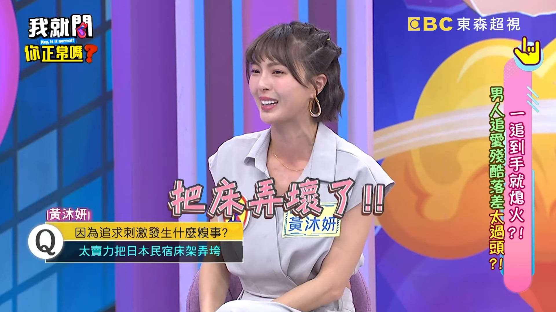 不僅如此,黃沐妍還分享最糗的床事經驗,透露有一次連同男友跟家人一起到日本旅遊,結果晚上「玩太嗨」,甚至把床弄壞,由於情況太過尷尬不好意思開口,「我就默默地把錢都放在床頭櫃」,還為了避免家人起疑,故意說謊把錯推給民宿。最刺激的是,當天晚上爸媽就住在隔壁,她還強調:「沒有吵喔,我很安靜。」讓眾人全笑翻。