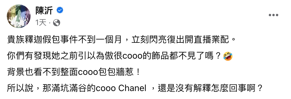 由於陳沂日前曾發文開酸:「貴族釋迦假包事件不到一個月,立刻閃亮復出開直播業配。你們有發現她之前引以為傲很cooo的飾品都不見了嗎? 背景也看不到整面cooo包包牆惹!」對此,王思佳直球對決,她表示:「房子越換越大間,背景本來就會換,怎麼辦?我又不像有些人,換湯不換藥。」
