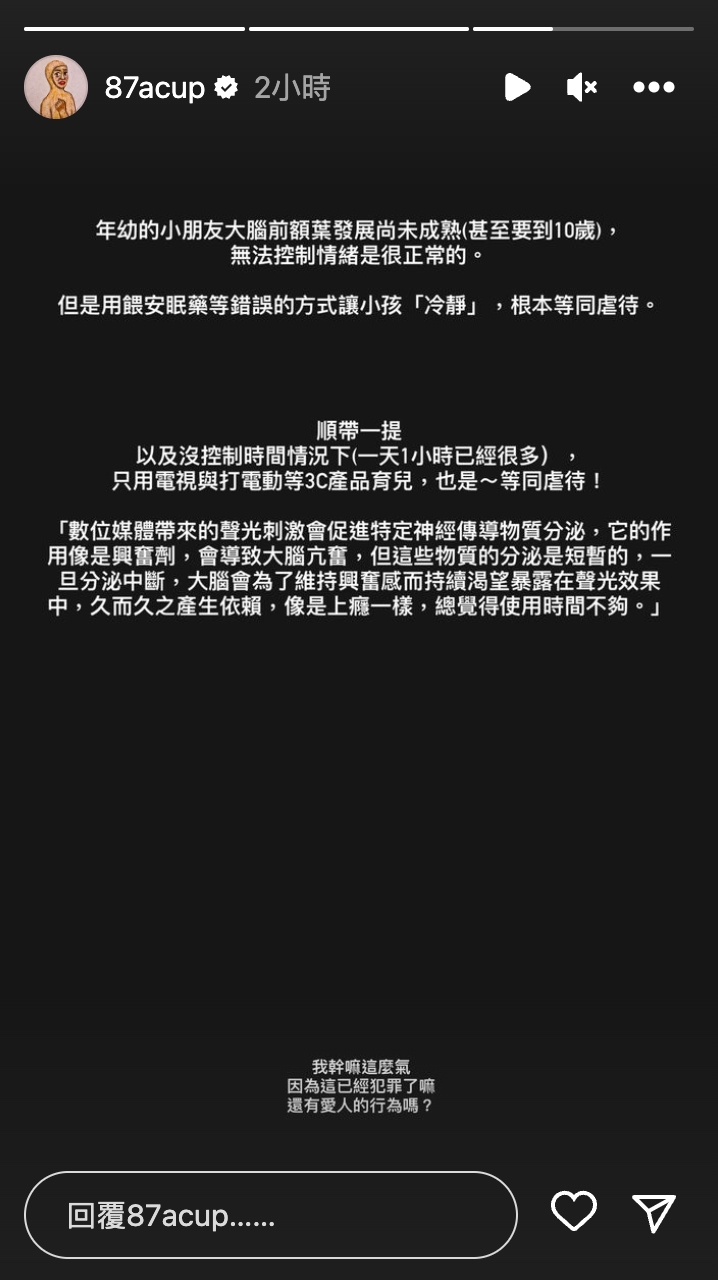 不僅如此,白癡公主認為小朋友大腦前額葉還沒發展成熟,無法控制情緒是很正常的事情,「但是用餵安眠藥等錯誤的方式讓小孩『冷靜』,根本等同虐待。」此外,她還直言讓小朋友在毫無節制的情況下使用3C產品也是虐待,因為聲光刺激會讓特定的社經傳導物質分泌,會導致大腦亢奮,由於這種物質是短暫分泌,所以大腦為了維持興奮的感受所以會想要持續沈浸在聲光效果中,「久而久之產生依賴,像是上癮一樣」。最後,她表示:「我幹嘛這麼氣?因為這已經犯罪了嘛,還有愛人的行為嗎?」