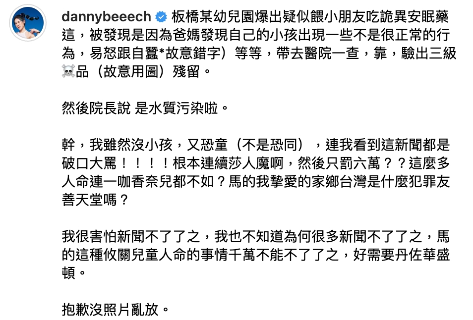 某幼兒園日前爆出有名女老師疑似透過餵安眠藥的行為,使小朋友安靜聽話,惡行遭到揭露後,立刻引起大眾的不滿。對此,網紅丹妮婊姐怒斥:「根本連續莎(殺)人魔啊,然後只罰六萬?」白癡公主也氣炸表示:「等同虐待!」