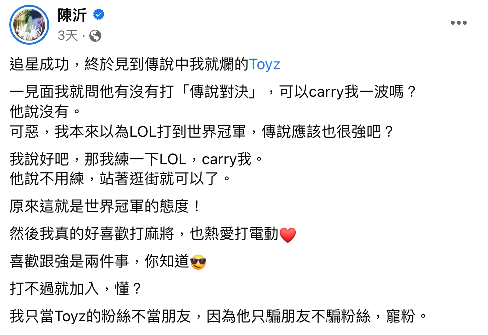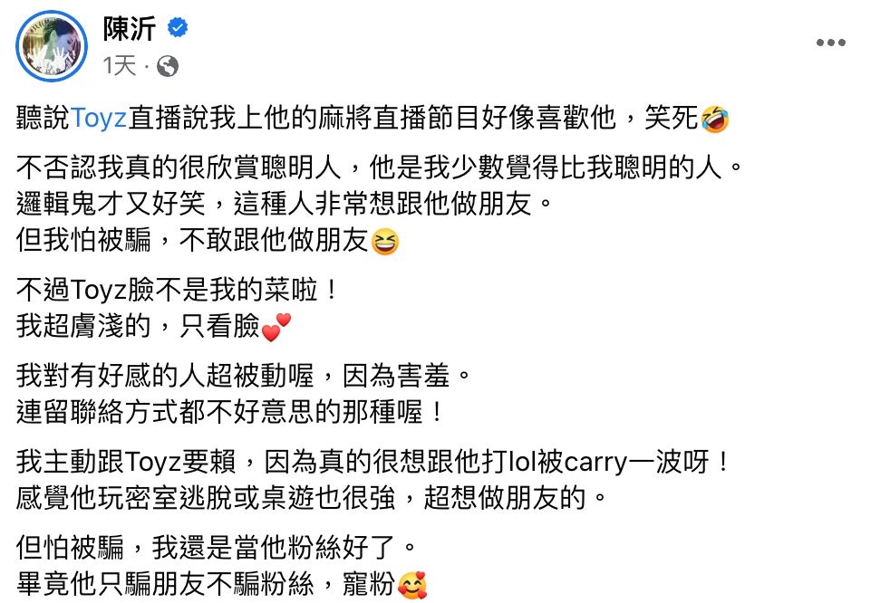 網紅Toyz日前在節目《麻將之星》與陳沂同台,他在直播中回顧當天的狀況,他表示:「我感覺陳沂喜歡我」,更當場向對方示愛,還約「生小孩」!對此,陳沂坦言想跟對方做朋友,但不忘吐槽對方的長相不夠帥,讓Toyz爆氣怒嗆:「妳都39(歲)了,還在看臉!妳怎麼這麼不懂事啊!」讓網友全都笑翻。